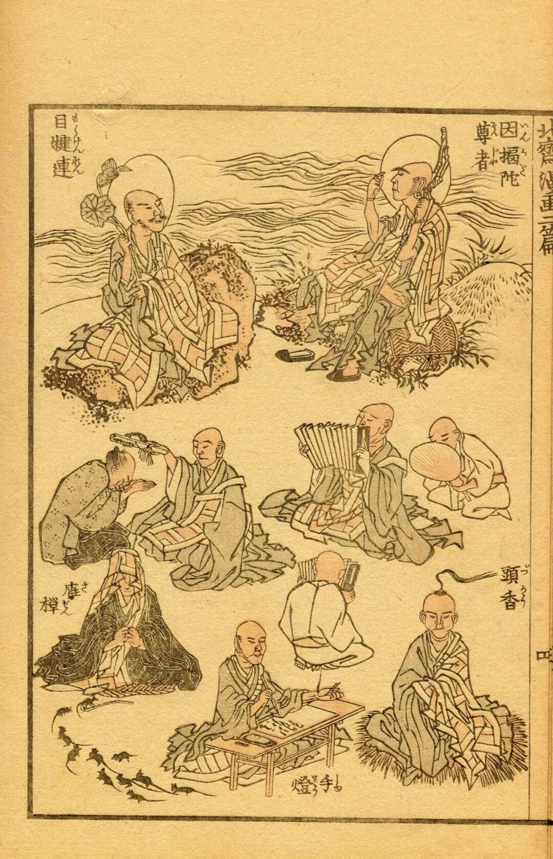 画面中部僧人敲钲的过程,是北斋漫画第一次出现同一人物的连续瞬间