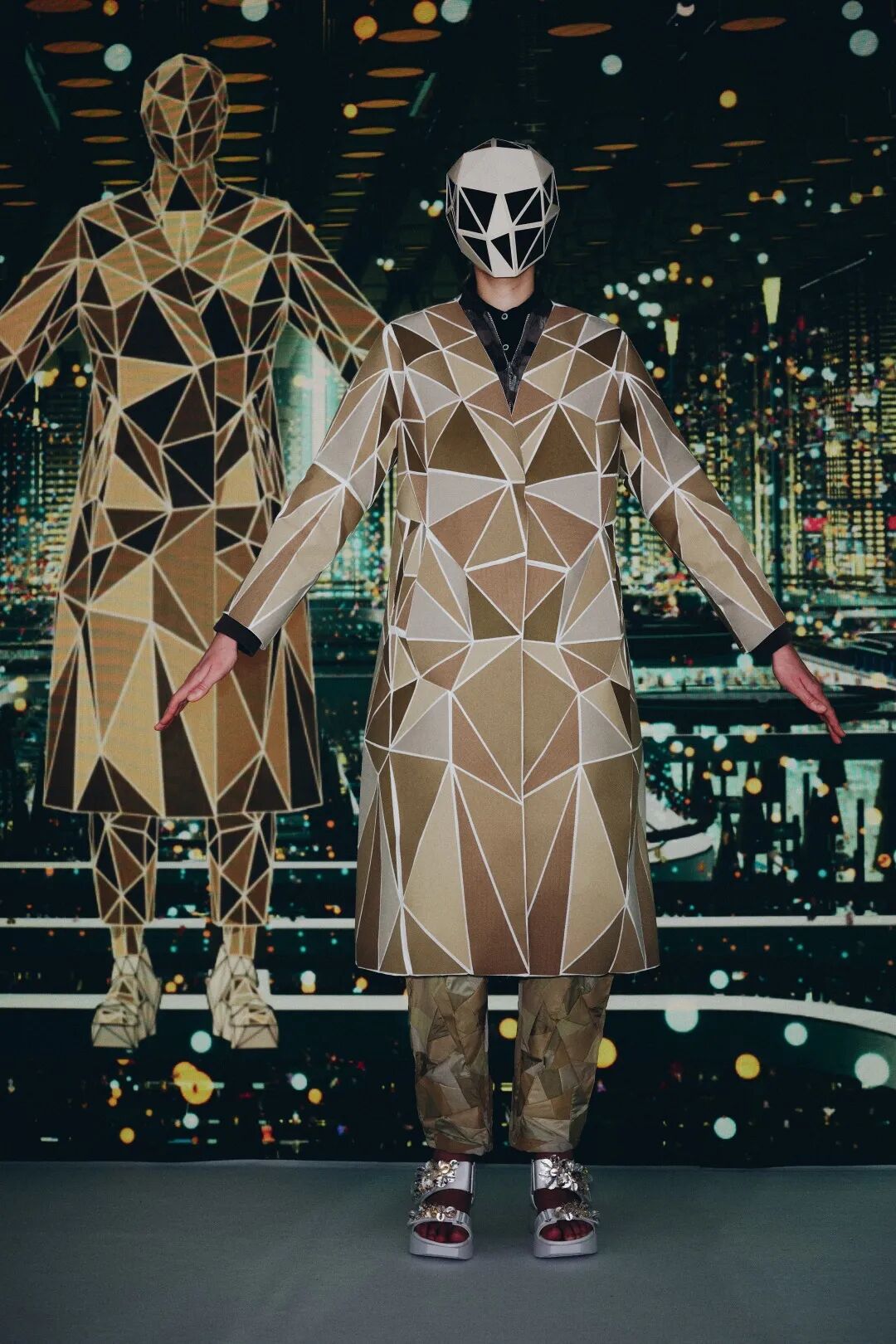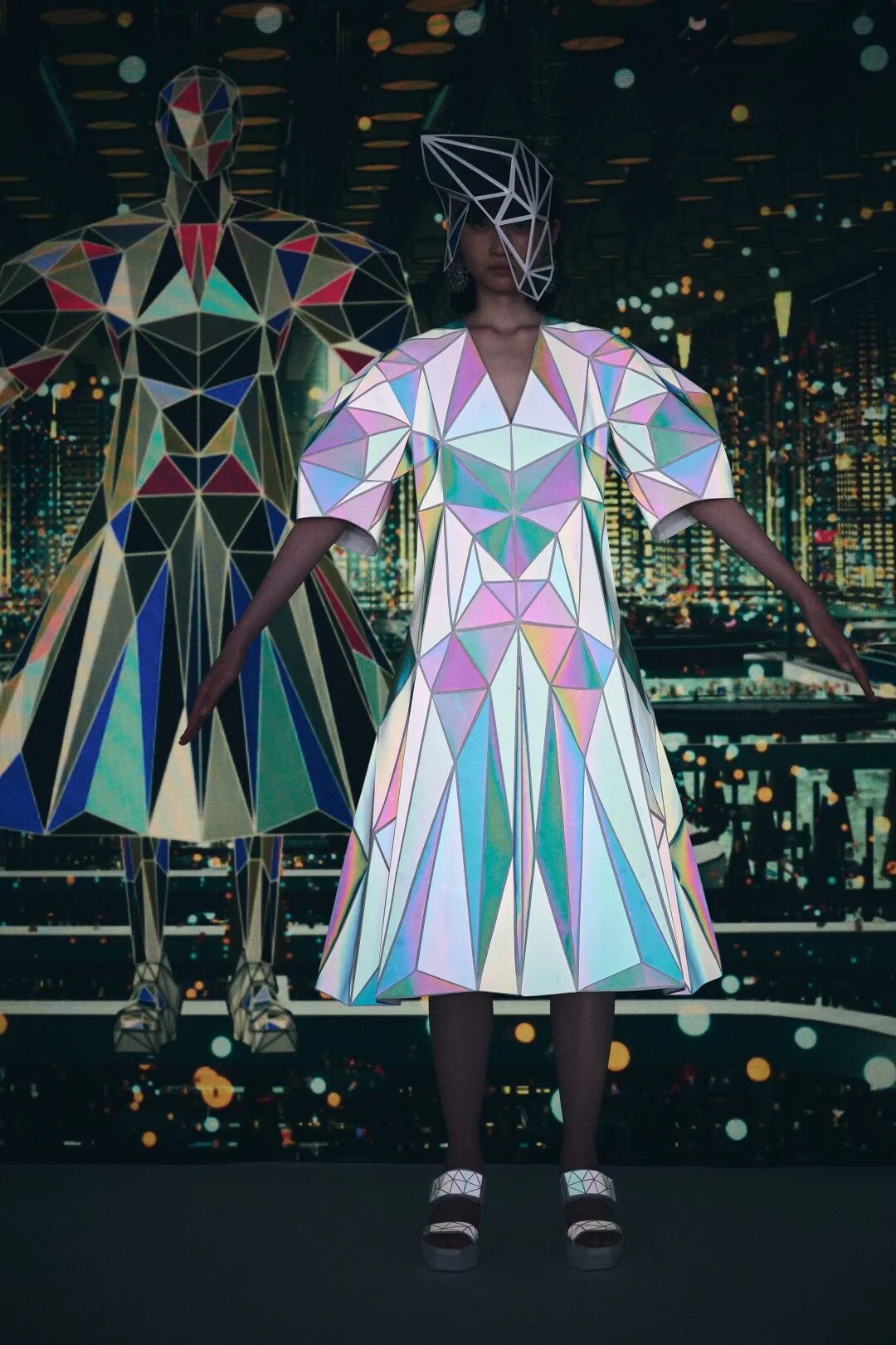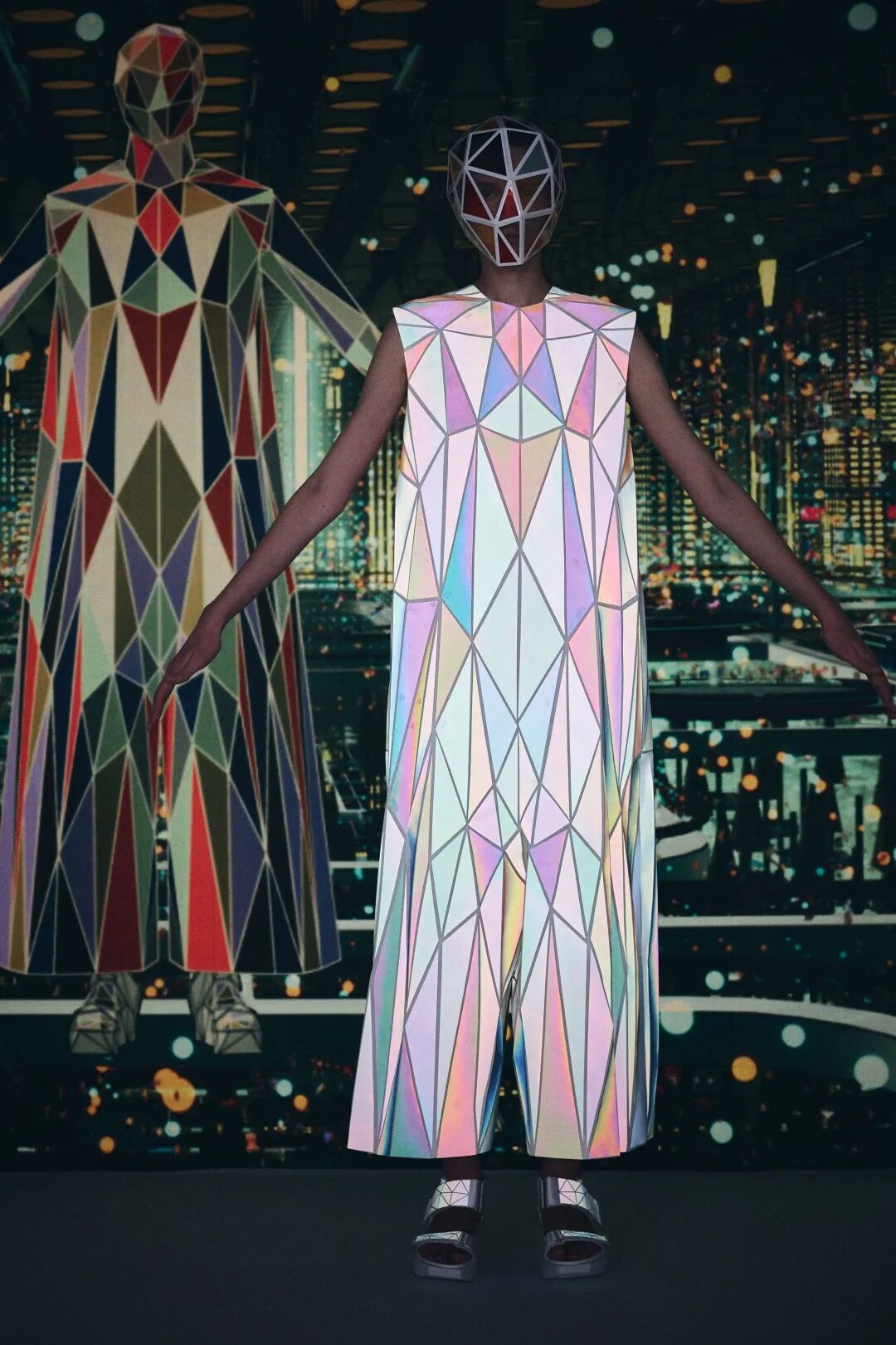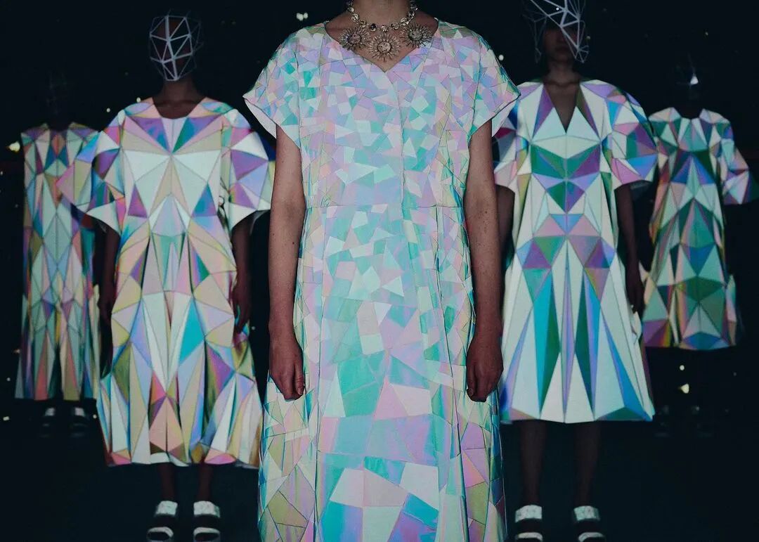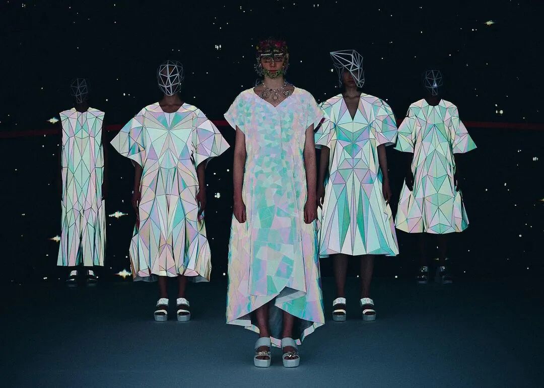 森永设计的服装不是通过裁剪和褶皱,而是通过剪切和粘贴。服装是由分形轮廓组成的数字服装,真实地代表了追溯到Metropolis和Tron的未来主义。回收的牛仔布等面料让有角度形状填充这些矢量空间,反射材料都做了无缝连接处理。
