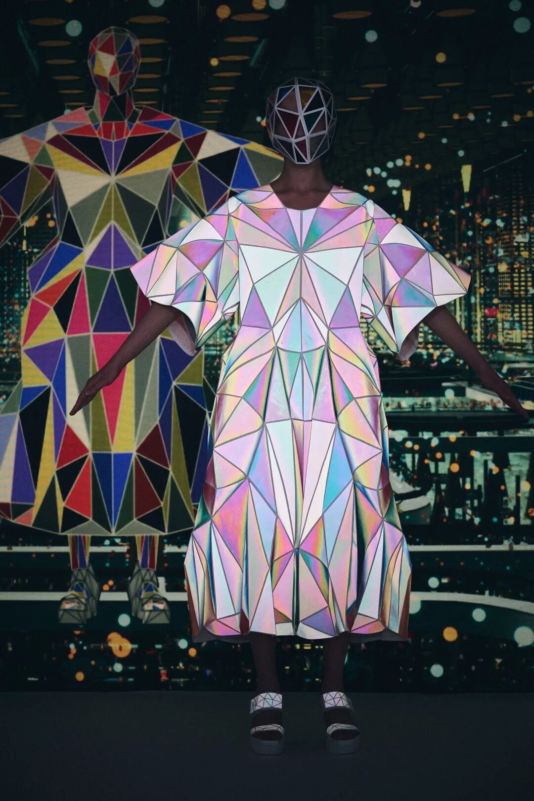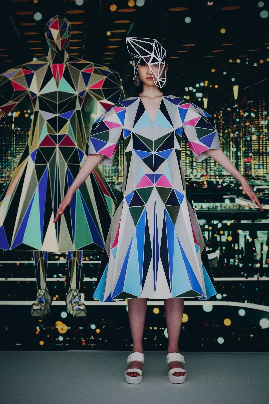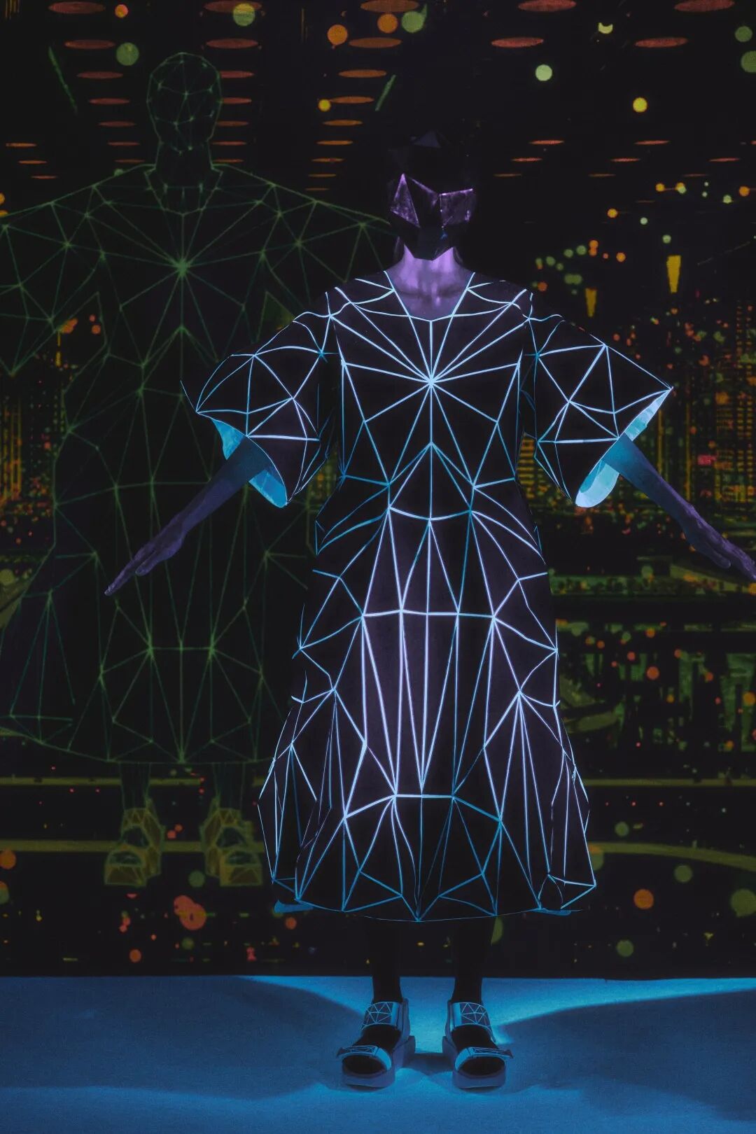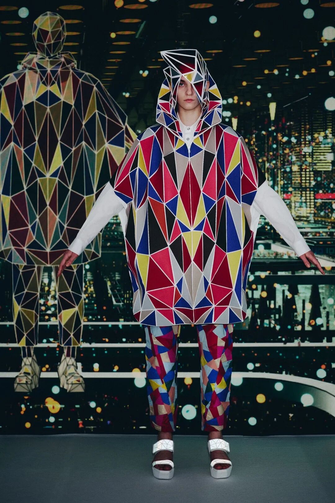 森永设计的服装不是通过裁剪和褶皱,而是通过剪切和粘贴。服装是由分形轮廓组成的数字服装,真实地代表了追溯到Metropolis和Tron的未来主义。回收的牛仔布等面料让有角度形状填充这些矢量空间,反射材料都做了无缝连接处理。