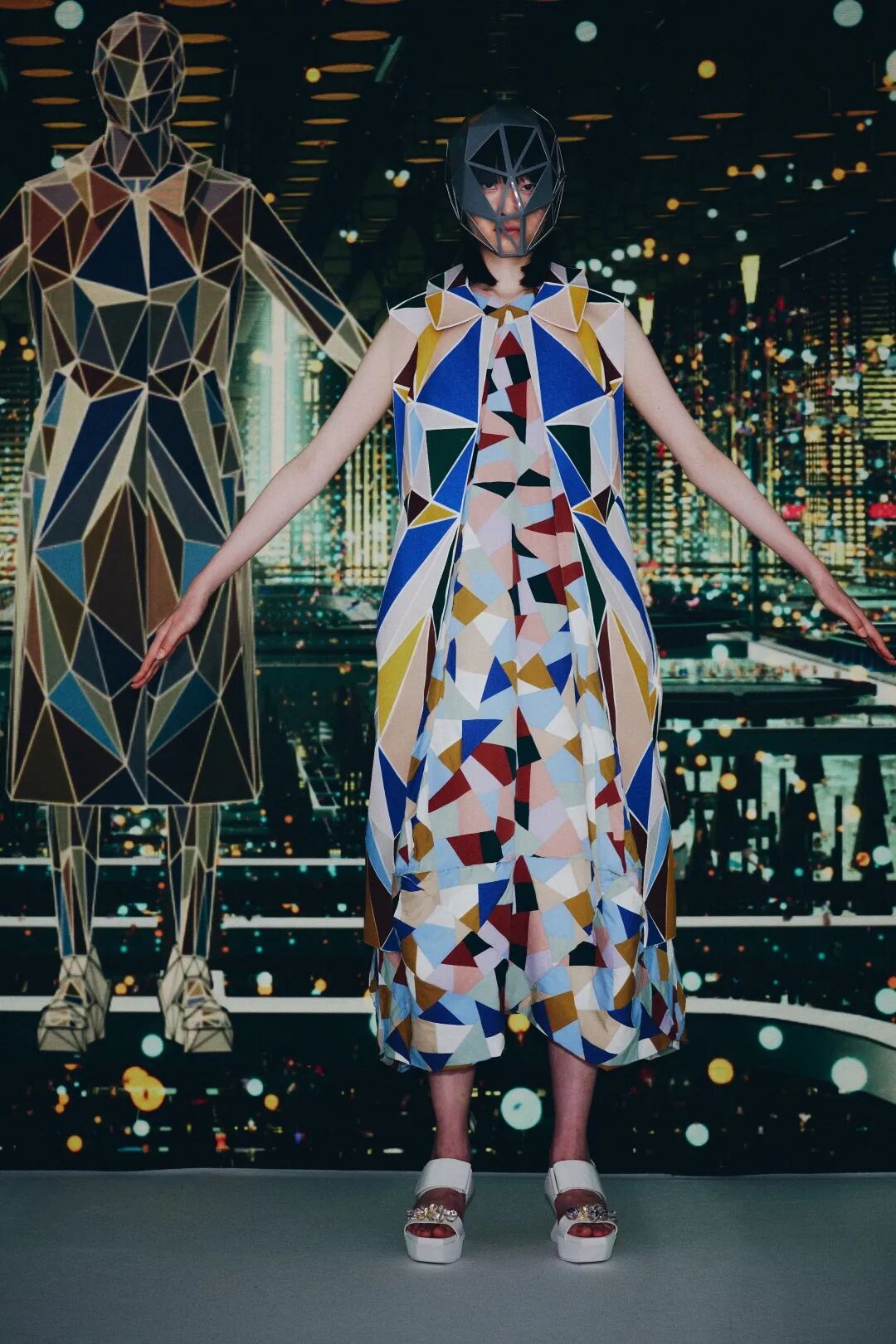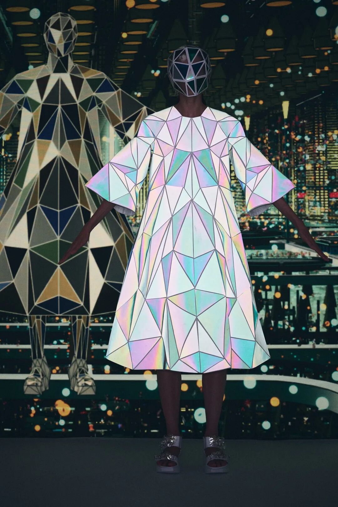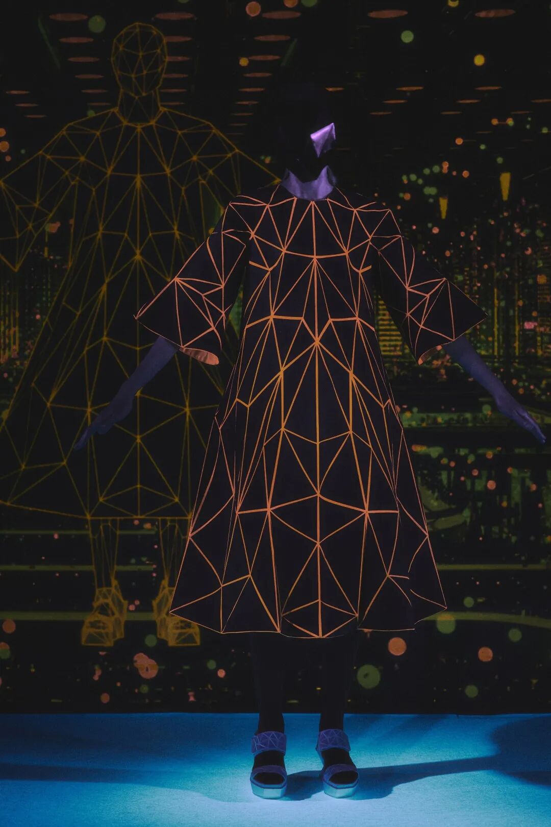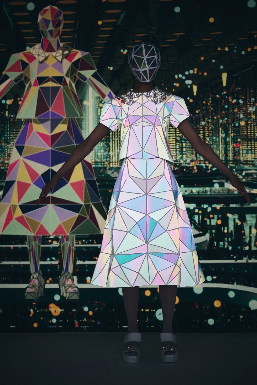 森永设计的服装不是通过裁剪和褶皱,而是通过剪切和粘贴。服装是由分形轮廓组成的数字服装,真实地代表了追溯到Metropolis和Tron的未来主义。回收的牛仔布等面料让有角度形状填充这些矢量空间,反射材料都做了无缝连接处理。