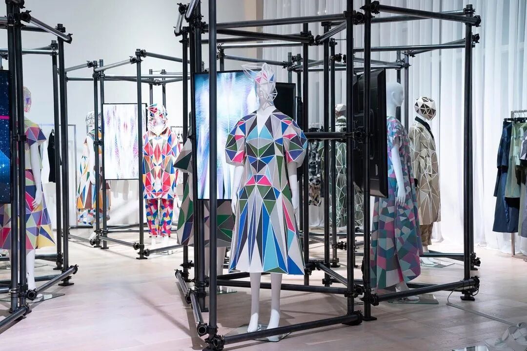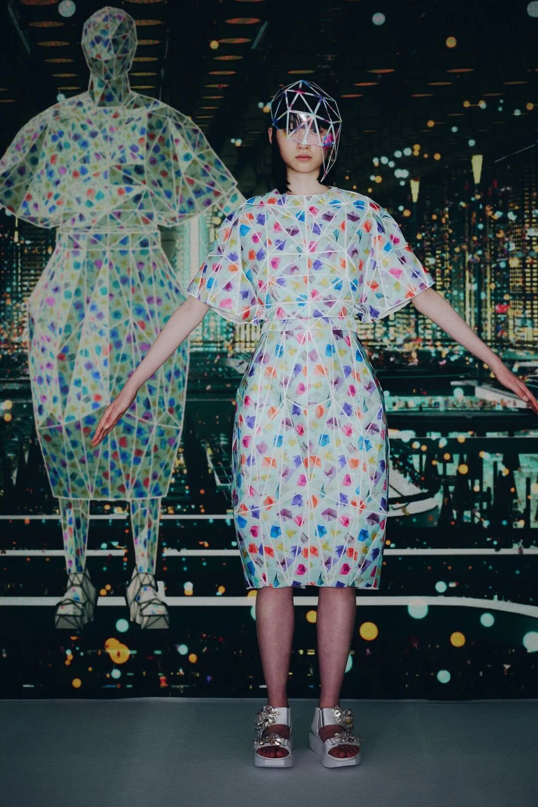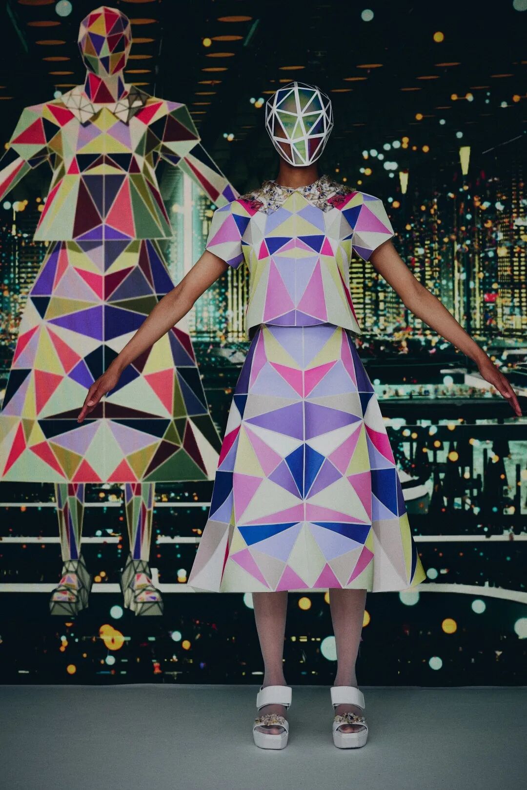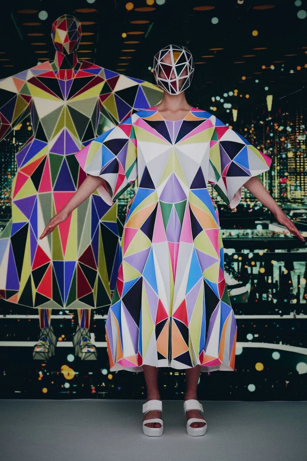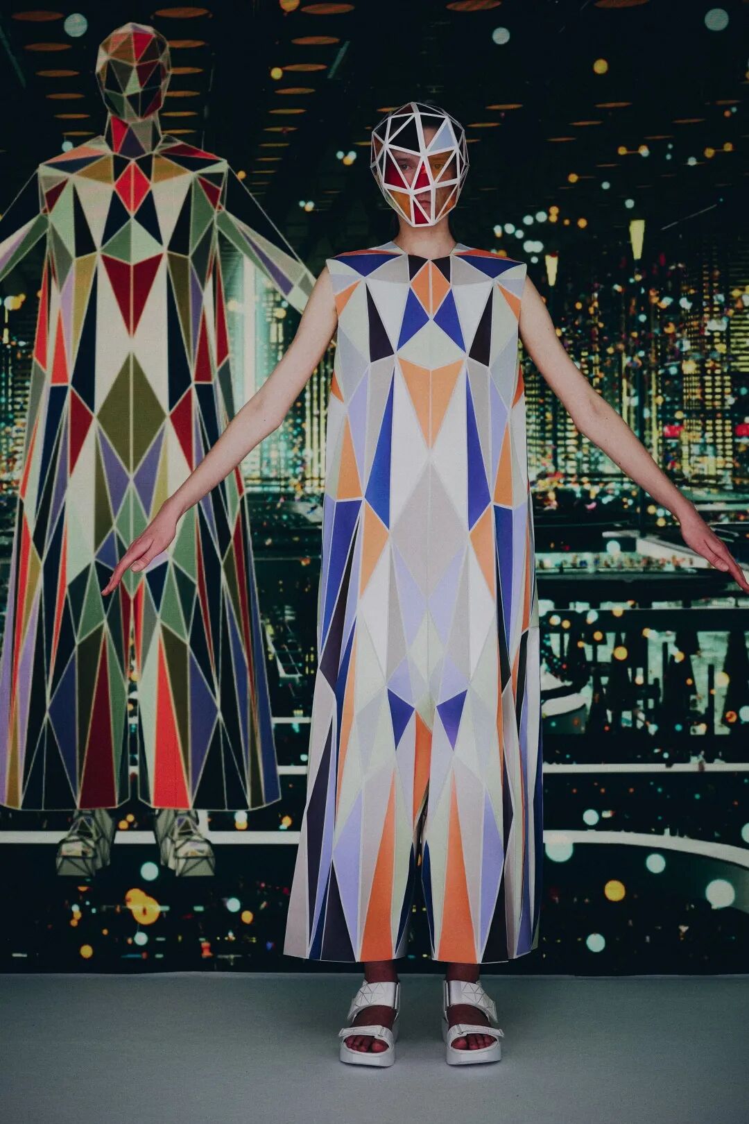 森永设计的服装不是通过裁剪和褶皱,而是通过剪切和粘贴。服装是由分形轮廓组成的数字服装,真实地代表了追溯到Metropolis和Tron的未来主义。回收的牛仔布等面料让有角度形状填充这些矢量空间,反射材料都做了无缝连接处理。