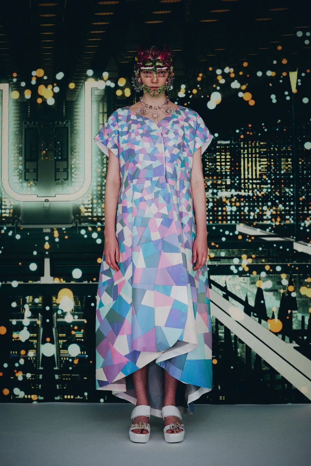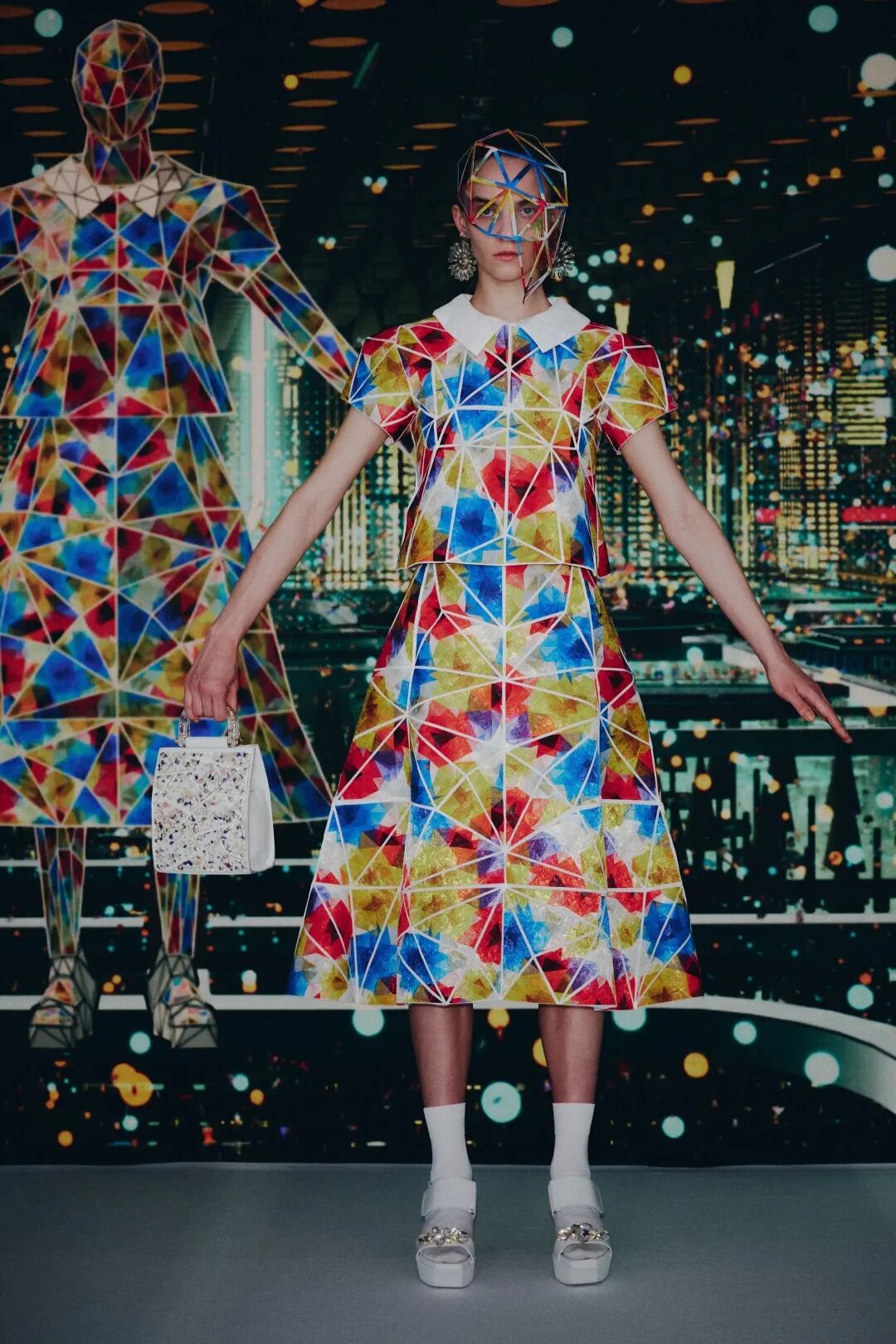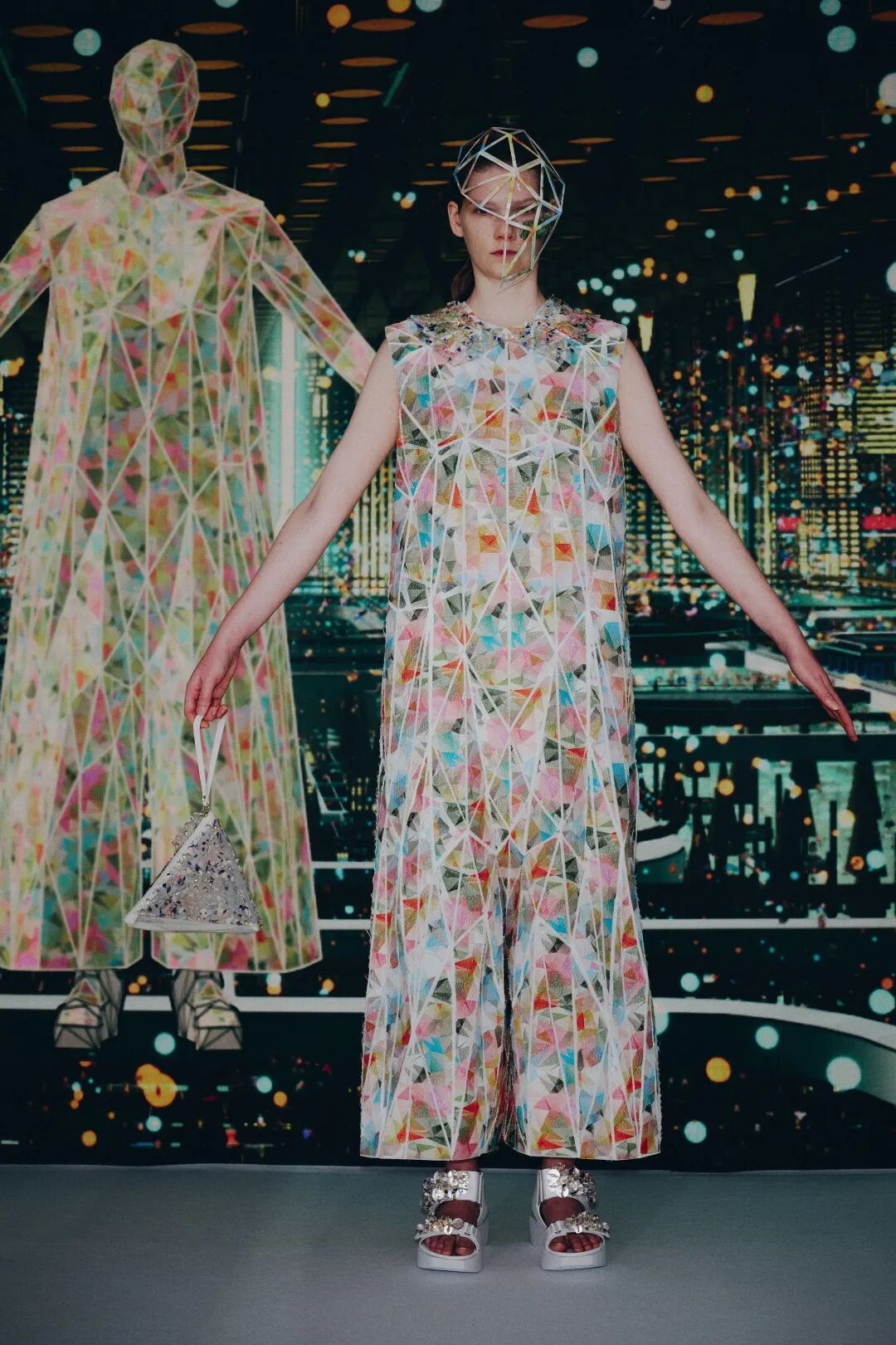 森永邦彦以“DIMENSION”为主题,探索着栖息在人们心中的时尚与人的形式,以及事物外部的各种织物之间的联系。在真实与虚拟之间的往复,犹如摆渡在数字星河之中的人们,来自《龙和雀斑公主》的二次元的背景,更是将虚拟空间“U”中的科幻值拉满。