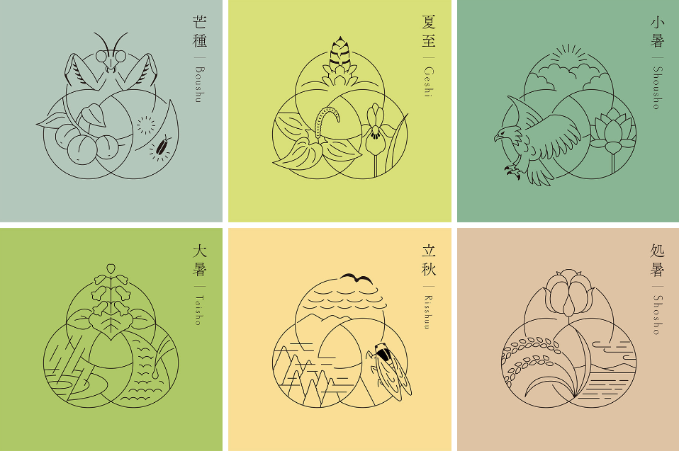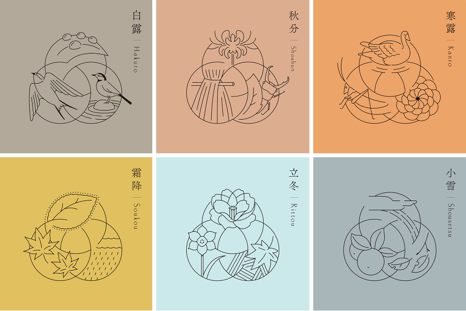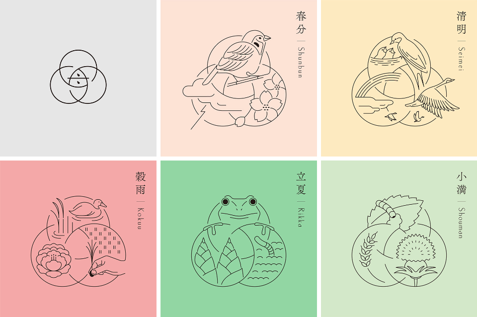 Kinoene omoya 提供24sekki(24 季)卡以及时令美食。每张卡片都根据 DIC 颜色指南中定义的传统日本颜色着色,第一季、第二季和最后一季的每一季都作为插图在符号上表示。