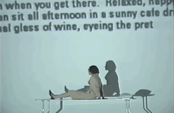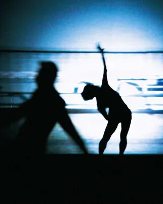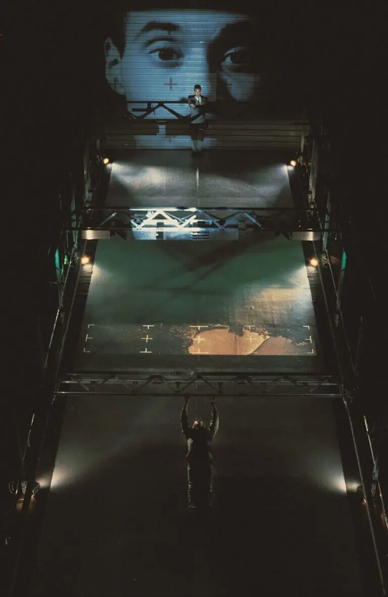 两个计算机驱动的横梁持续地在房间内来回移动,将图像投射到下面的表演者身上。表演者不得不跳过较低的横梁或躺在地板上,因为它像一台巨大的扫描仪一样,从他们身上掠过。