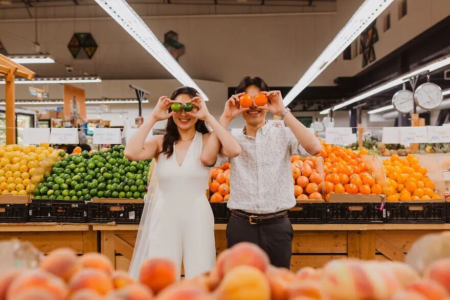 他们邀请摄影师安娜·阮为他们拍摄了一组最“草率”的婚纱照,拍摄地点选在了自己家附近的一家杂货店,两人的身后,就是装满蔬菜水果的货架。没有矫揉造作的姿势,也没有过度的P图美颜,一颗水果,一把蔬菜就是他们最自在的道具。男生穿着最舒服的衬衫,女生随意的发型,最终照片出来的效果让人感到意外,既真实,又不缺仪式感。