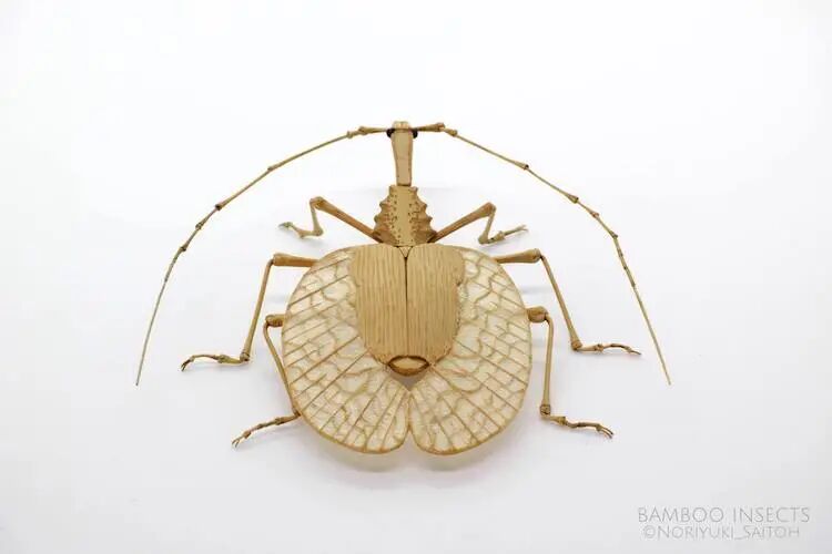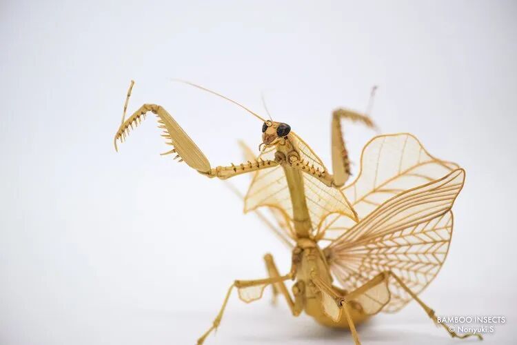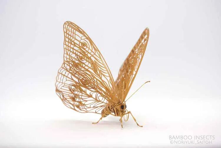 竹子在这位艺术家的手中,变成了令人难以置信的细致竹虫,从蜻蜓、蝴蝶到甲虫和、蜘蛛,斋藤徳幸用极大的耐心,和对细节的关注,精心雕刻了它们的触角、胸部和腿部,对于那些有翅膀的昆虫,艺术家还制作了复杂的竹骨架状框架,然后在顶部添加了半透明的牛皮纸,这样,昆虫的翅膀就更加生动逼真了,尤其是在阳光下,仿佛在闪闪发光。