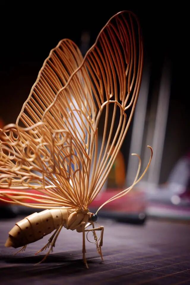 尽管每个人都清楚地知道,这些昆虫都是用竹子做成的,是假的,但人们在第一眼看到这些竹制昆虫的时候,还是会忍不住将它们认为是真实的昆虫。慢工出细活,据小绛所知,斋藤徳幸创作一个这样的作品,需要花费数周,甚至数月的时间,才能完成,虽然它的尺寸看起来并不大,但耗费的时间和精力,丝毫不比一个大型作品要少。