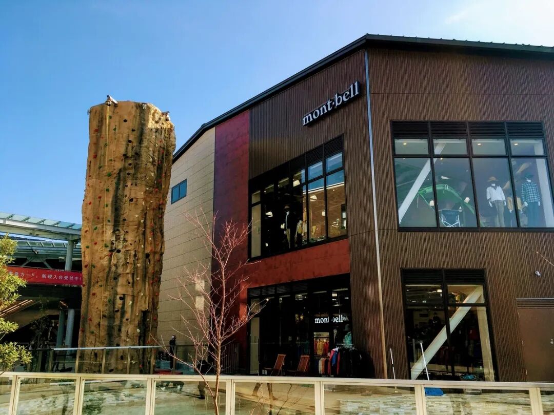 日本最大规模室外用品mont-bell店入口处高12米的攀岩柱,其入口处设有体验用划艇池设施。