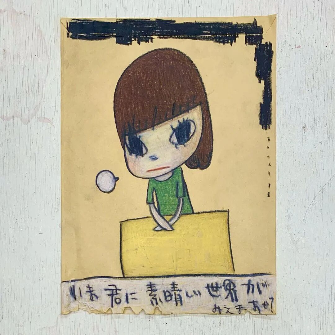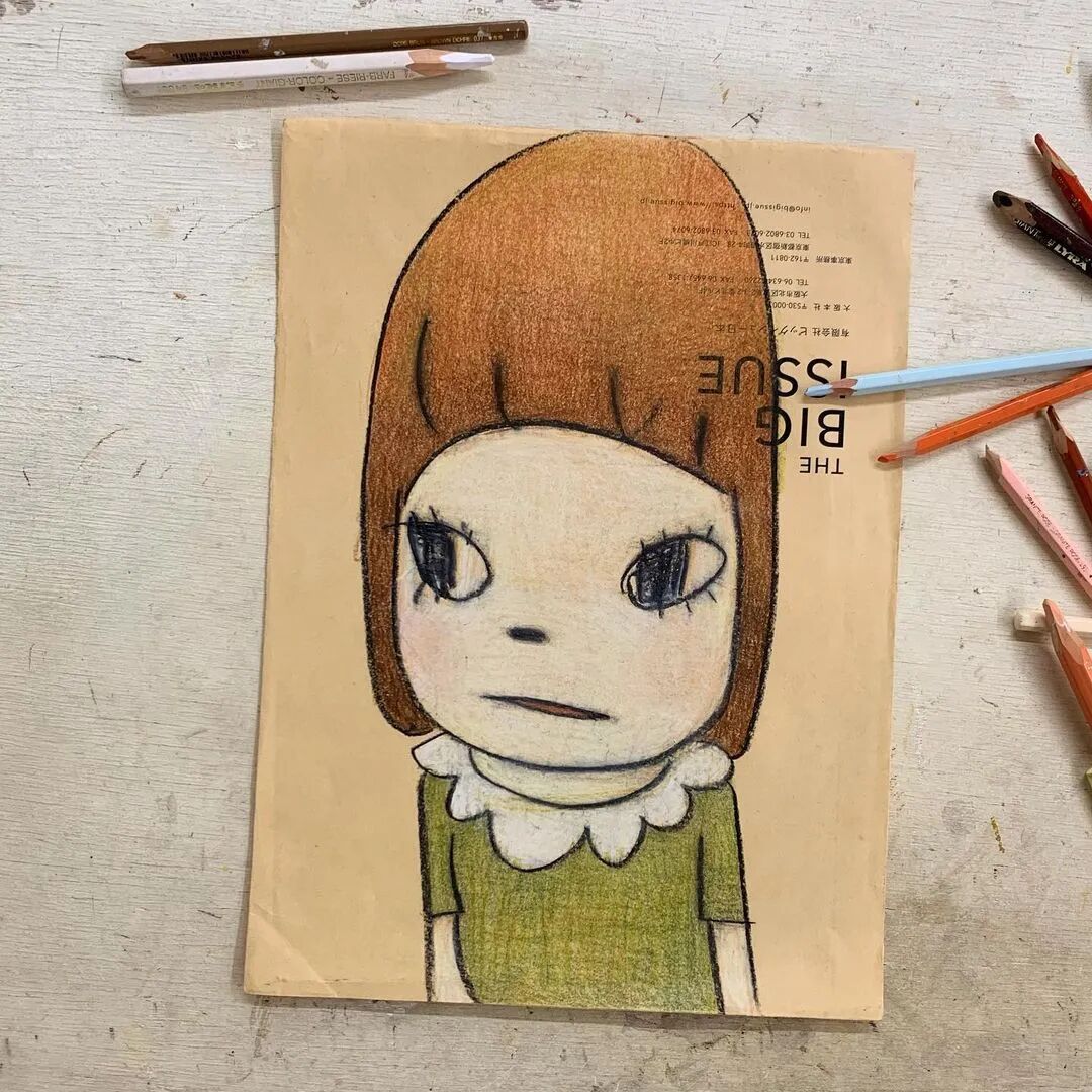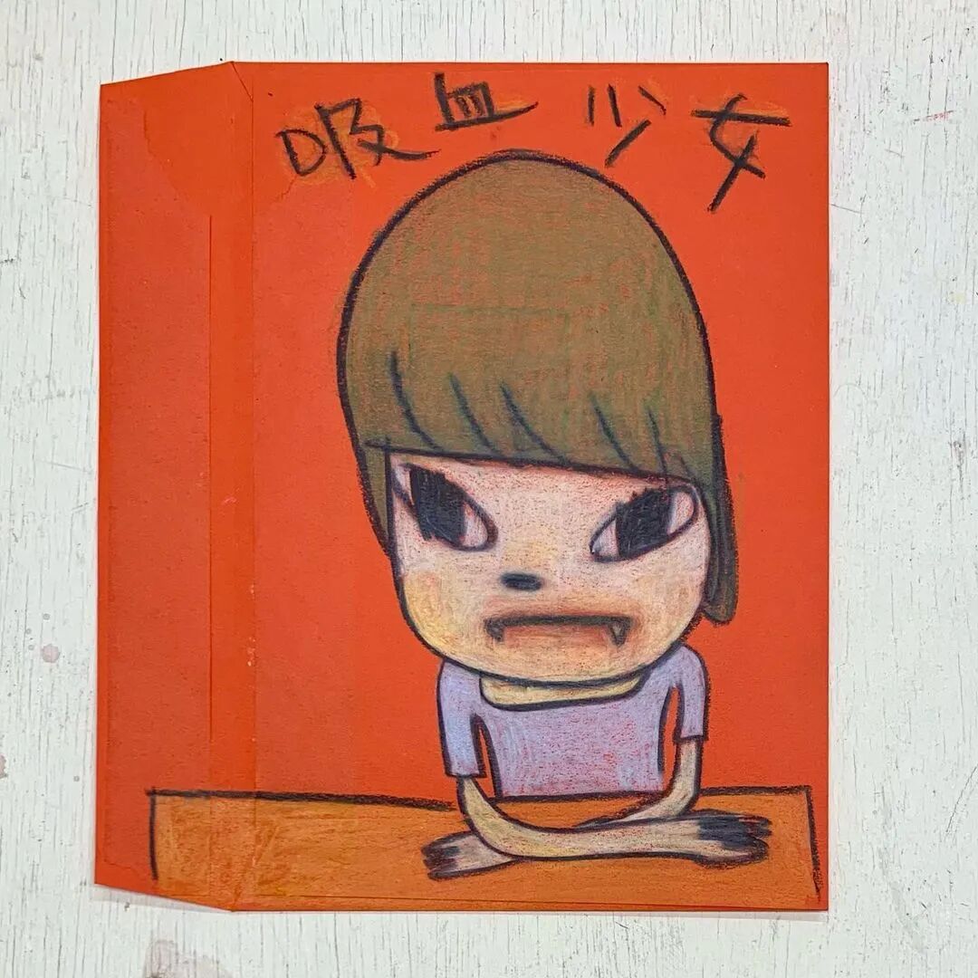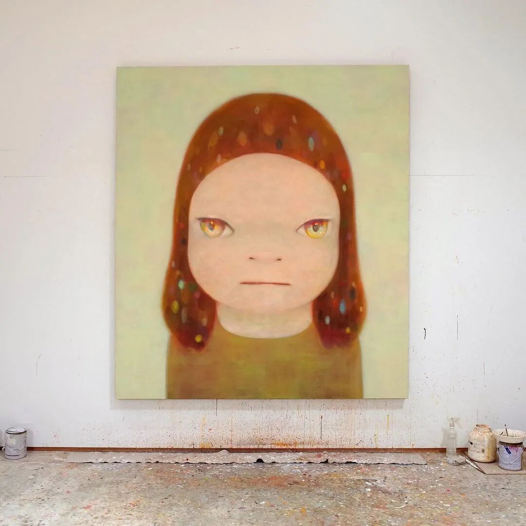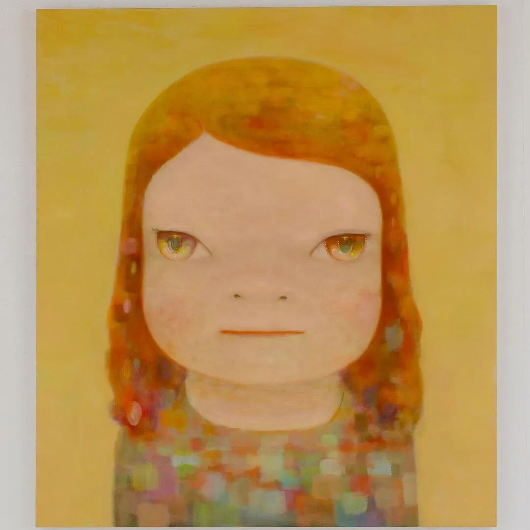 日本当代艺术家奈良美智@michinara3,笔下的小女孩总是有着大大的脑袋,招牌式的斜眼和瘪嘴的邪恶小表情,像成人一样。柔软的线条和温暖的配色与小女孩不友好的表情发生奇妙反应。