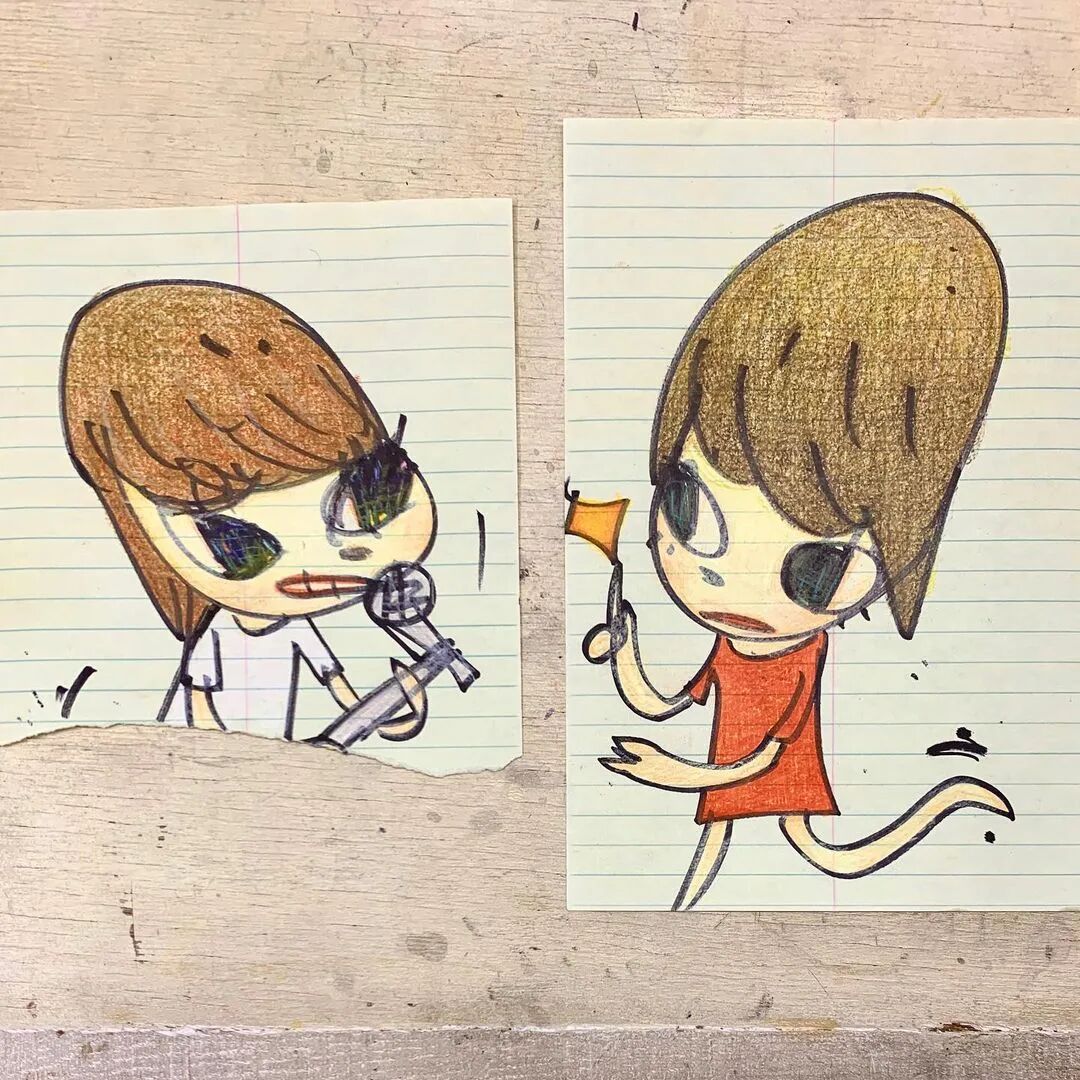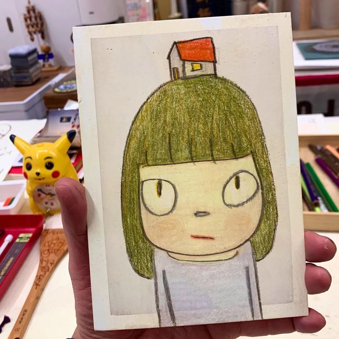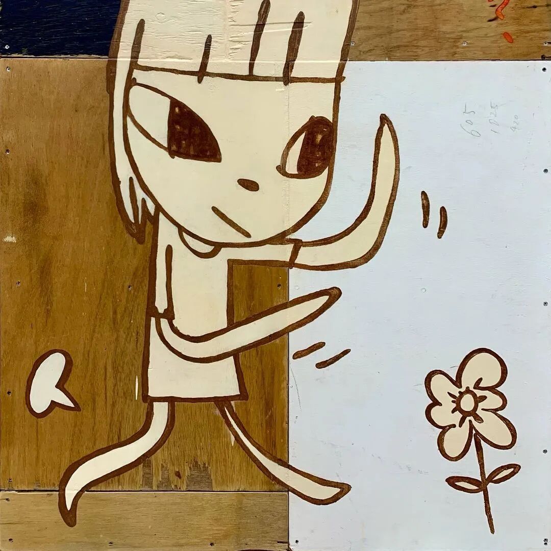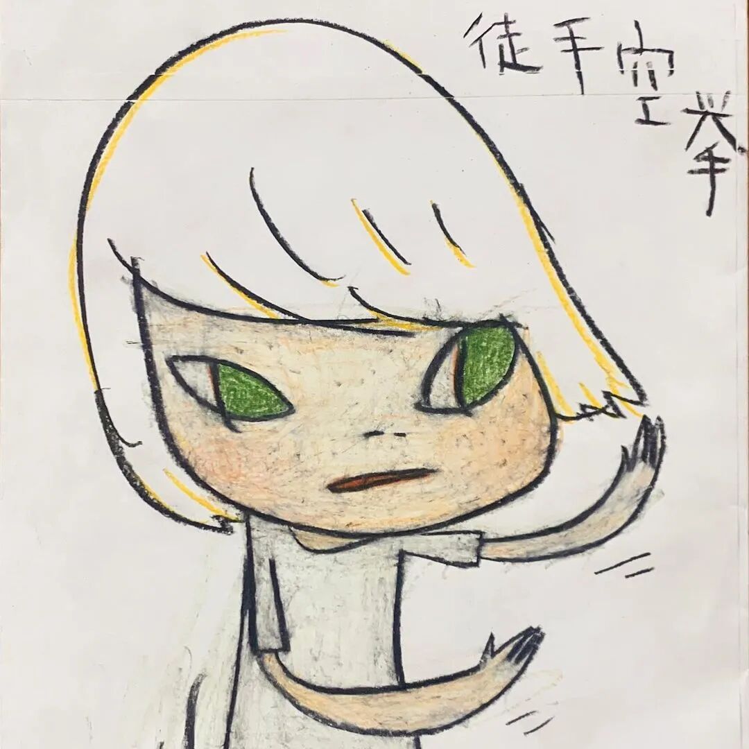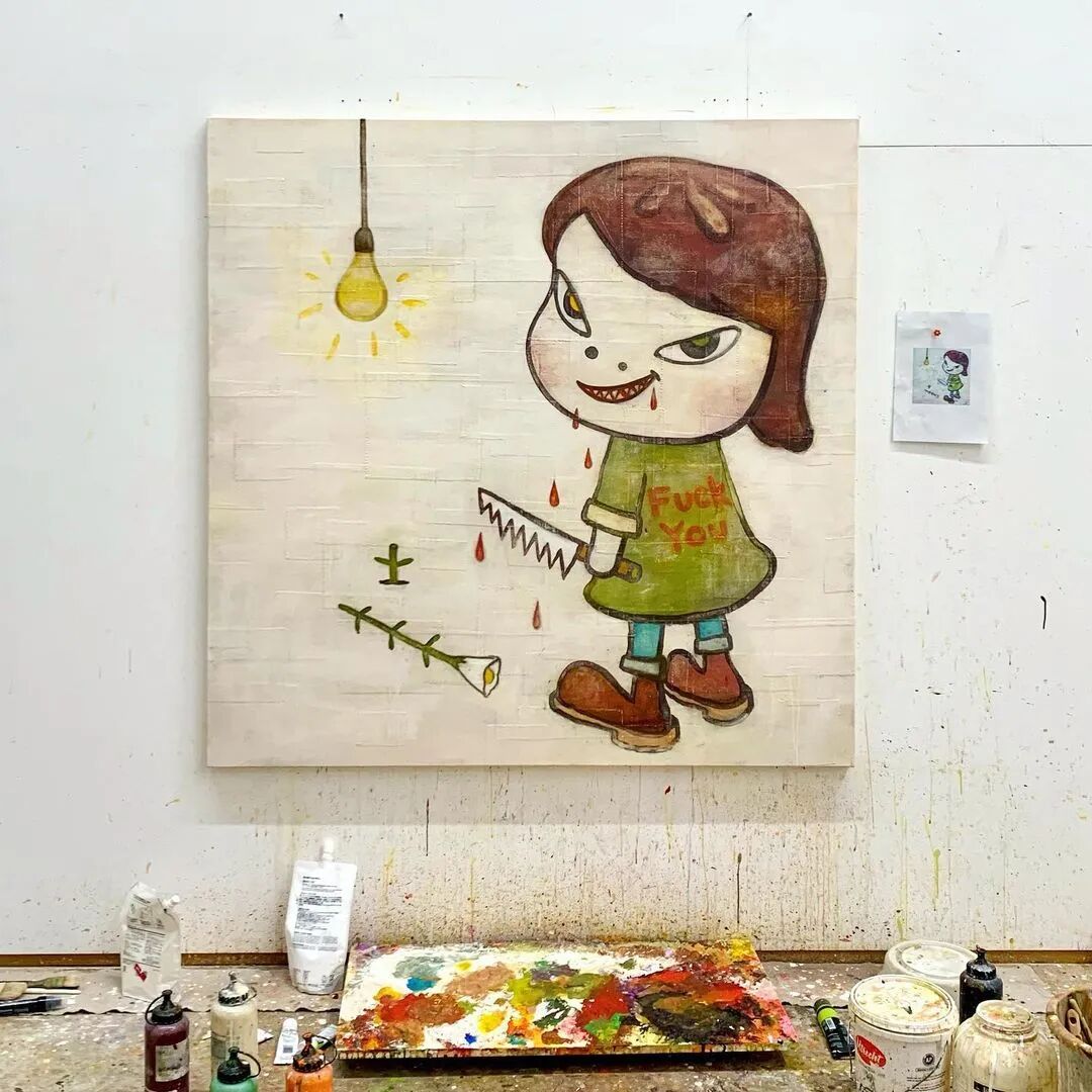 日本当代艺术家奈良美智@michinara3,笔下的小女孩总是有着大大的脑袋,招牌式的斜眼和瘪嘴的邪恶小表情,像成人一样。柔软的线条和温暖的配色与小女孩不友好的表情发生奇妙反应。