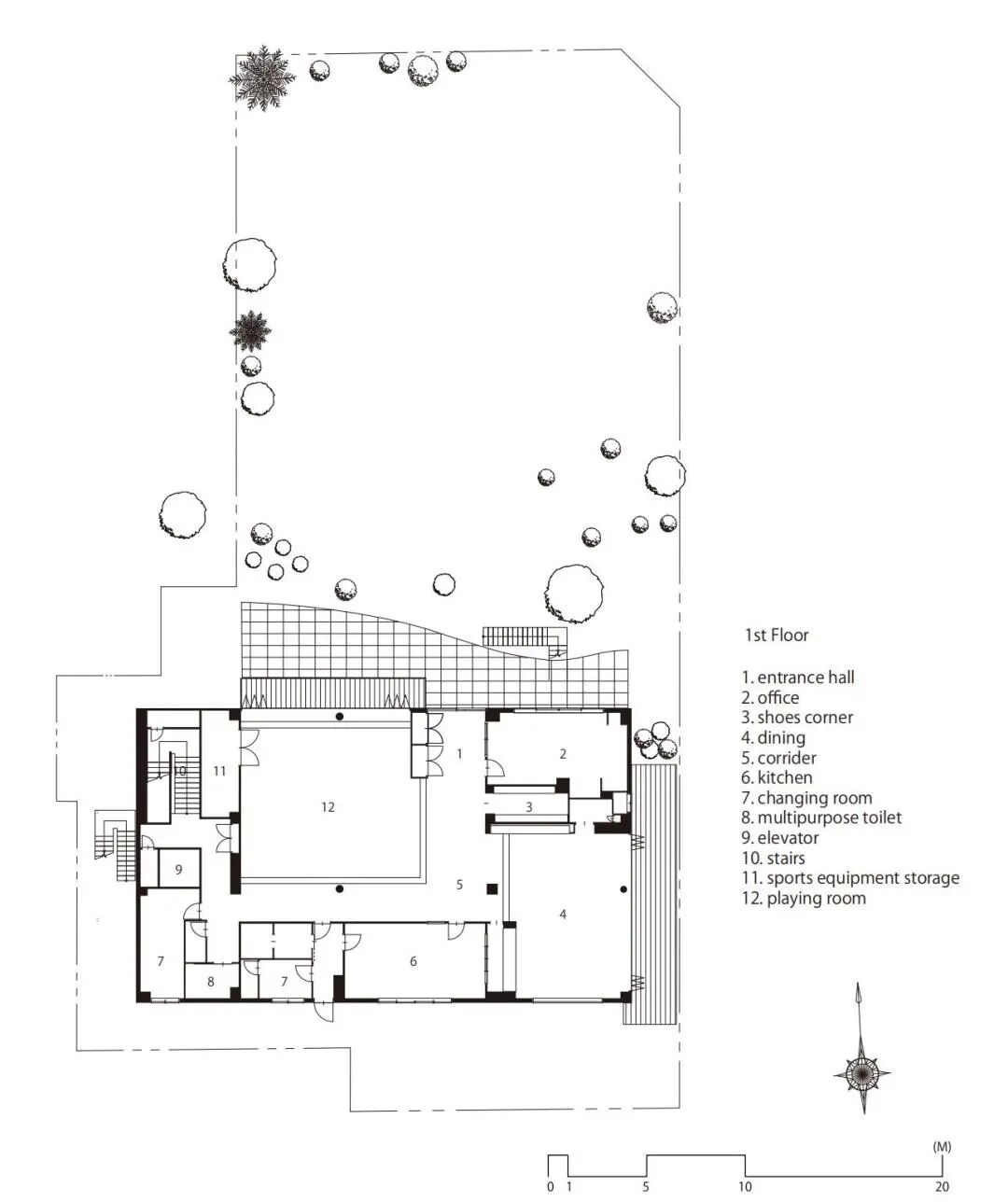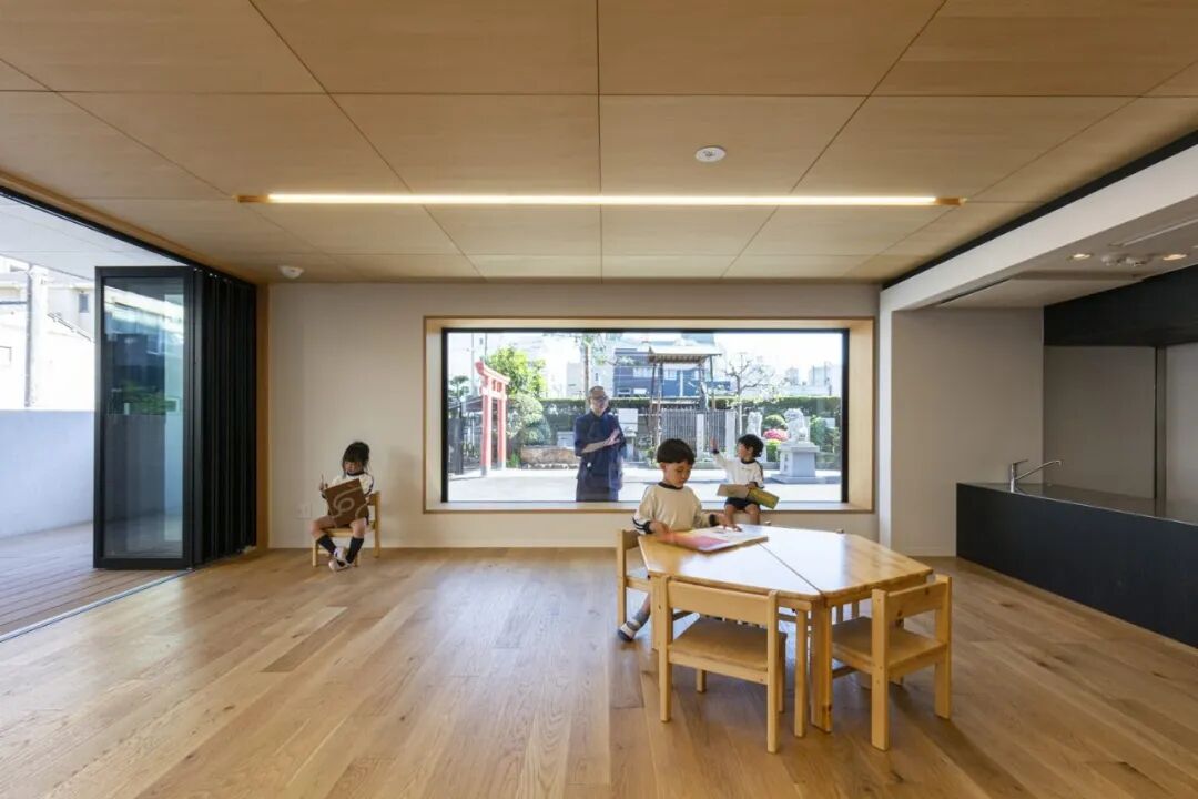 去往神社的参拜道路上,会遇见开了大透明窗的房间,里面是孩子们的活动场所。