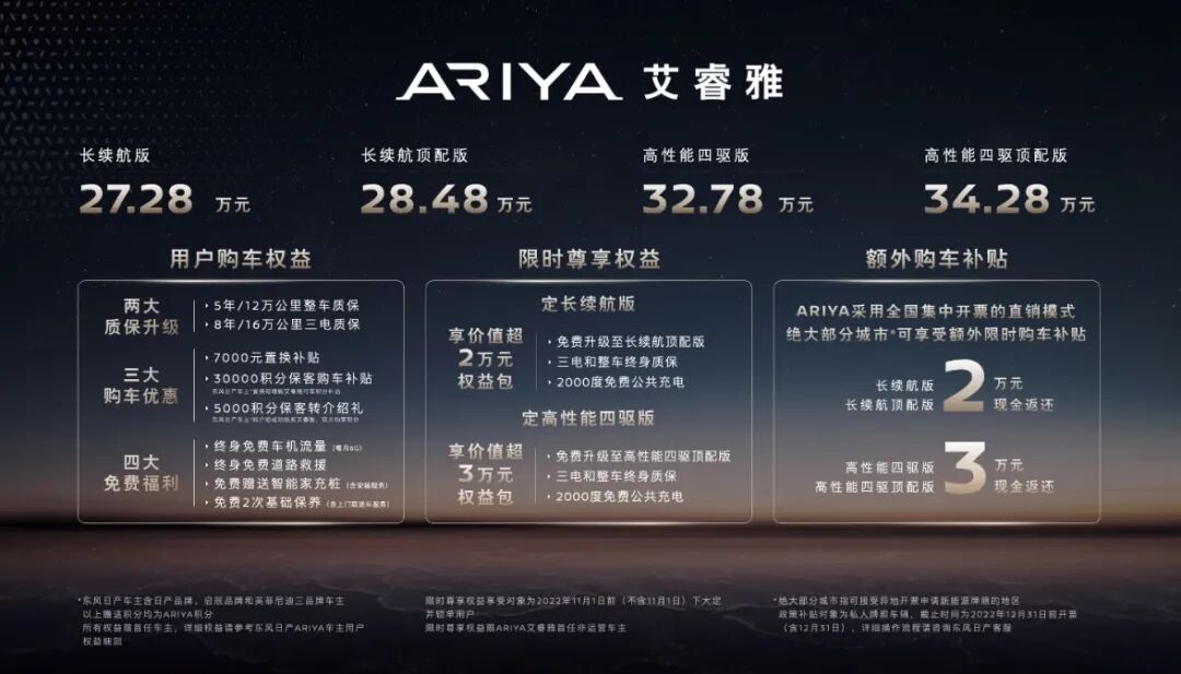 同时,ARIYA艾睿雅采用全国集中开票的直销模式,这意味着绝大部分城市还可享受额外限时购车补贴,其中,长续航版和长续航顶配版享2万元现金返还;高性能四驱版和高性能四驱顶配版享3万元现金返还。