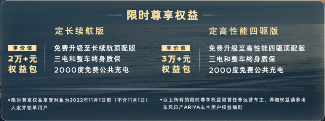 除首任车主可享受“两大质保升级、三大购车优惠、四大免费福利”以外,针对2022年11月1日前(不含11月1日)下大定并锁单的用户,还可享受厂家限时尊享权益。