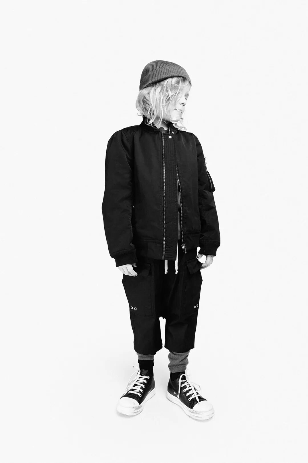 最近,Rick Owens 正式推出了全新的童装线 BABY GEO,第一批产品以主线 2022 秋冬 STROBE 系列为灵感,带来了十分经典的拉链飞行员夹克、羽绒马甲、抽绳工装裤,以及 Geobasket 和 Ramones 等鞋款;