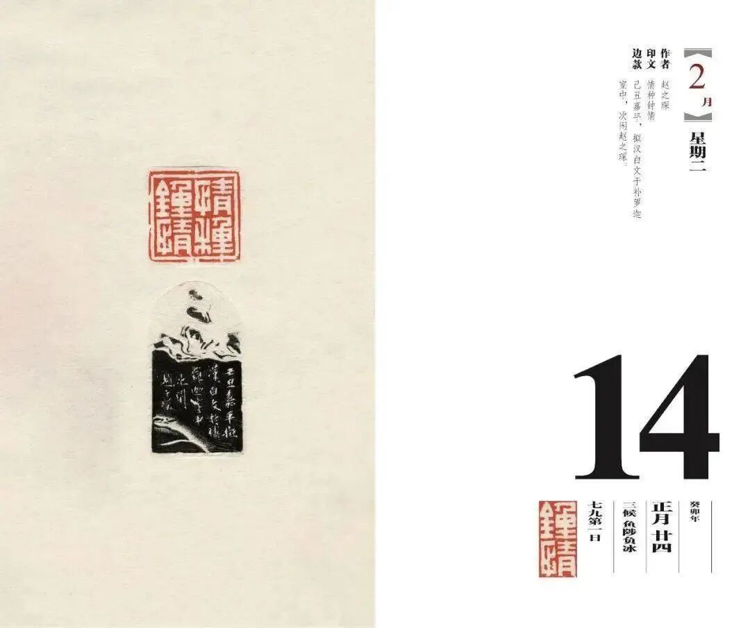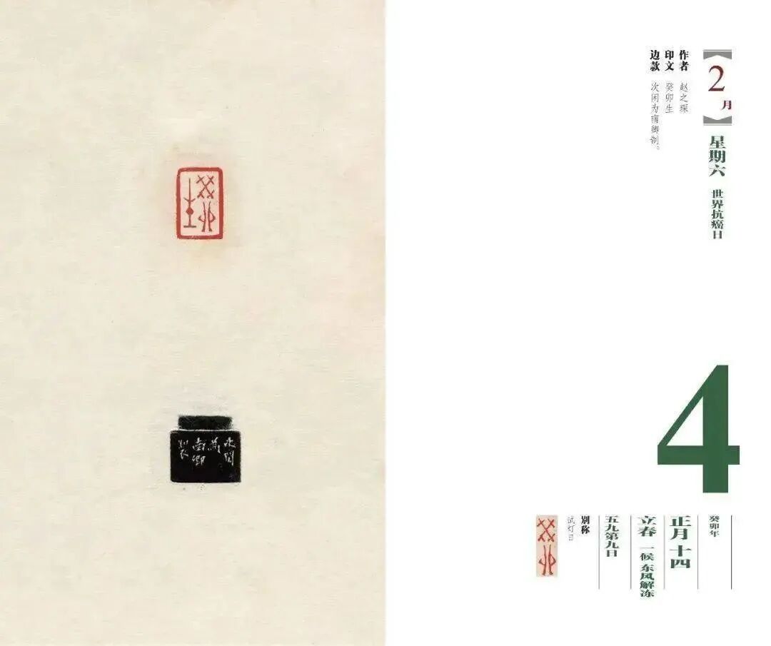 这本日历中遵从国家标准,以春节为干支纪年的更年,春节时选用来楚生的“癸卯”印,在立春时则用赵之琛的“癸卯生”印。
