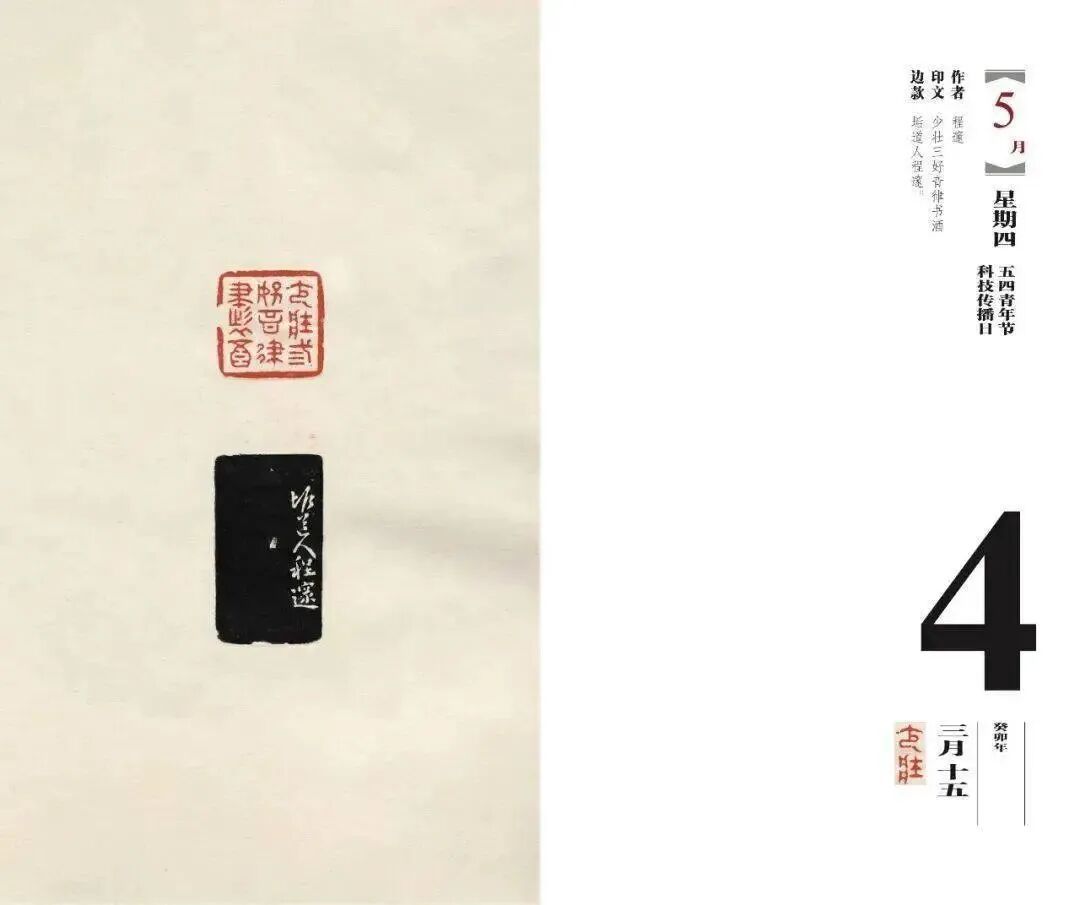 五四青年节,日历中选用了程邃所作“少壮三好音律书酒”。