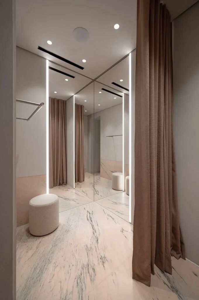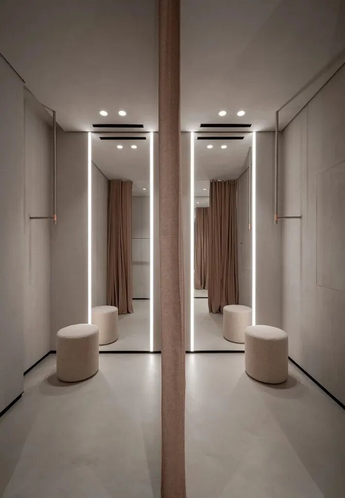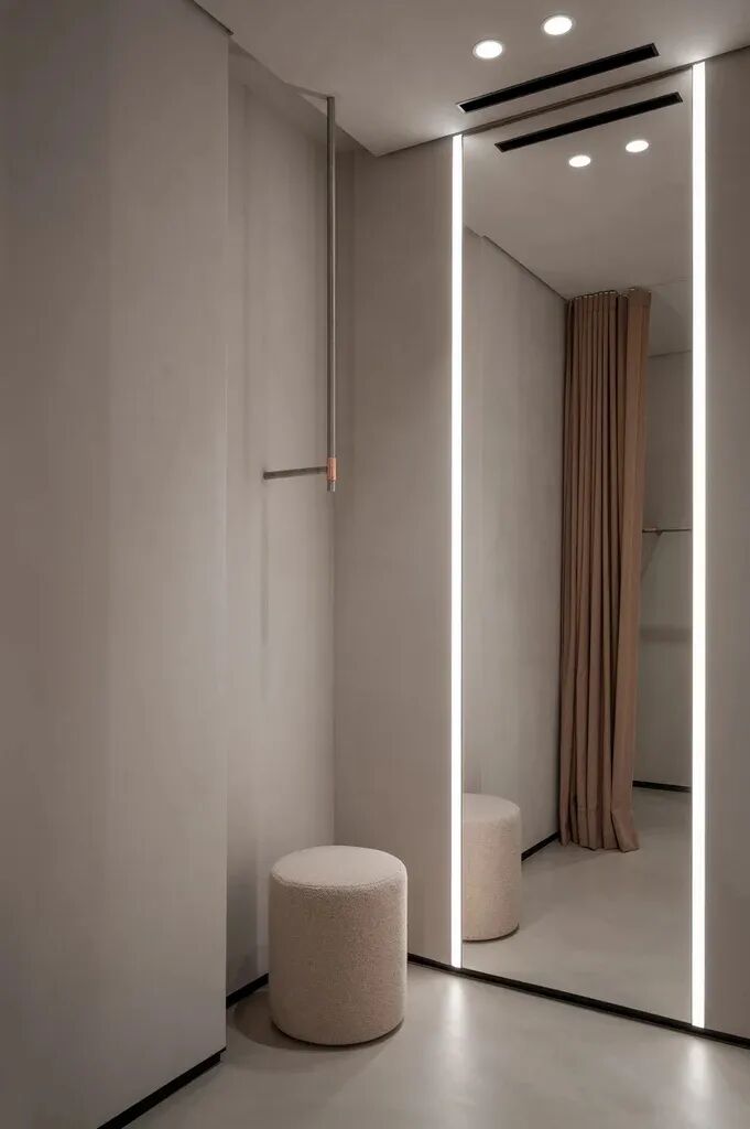 The lighting design deserves special attention. Given the low ceiling, we refrained from using busbars common for showrooms. Instead, we opted for a recessed wall washer lighting with the highest colour rendering index and no trims. The mirrors were upgraded with the built-in diffuse lighting profiles. This solution provides a flattering yet even light during the fitting, which is essential for sales. The copper-plated lamps are decorative and functional elements, supporting the aesthetic of the showroom.