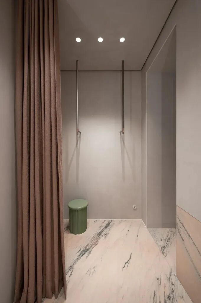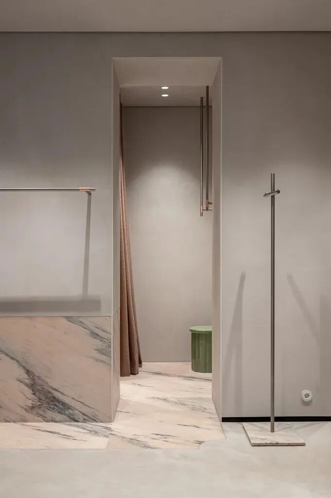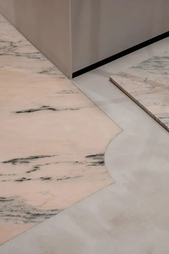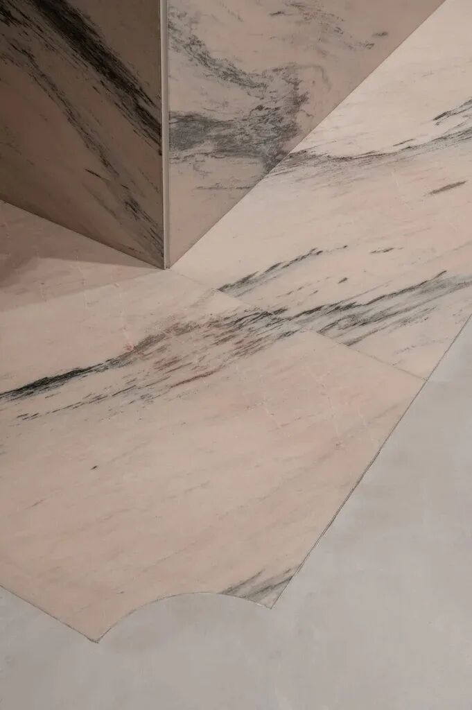Rosa Aurora石元素也带有粉色阴影。融入墙壁和地板,突出了主展区。这种类型的大理石也传达了自然的美丽和温柔,实现了Katya Silchenko的COAT概念。因此,整个调色板巧妙地统一了一个无所不在的色调