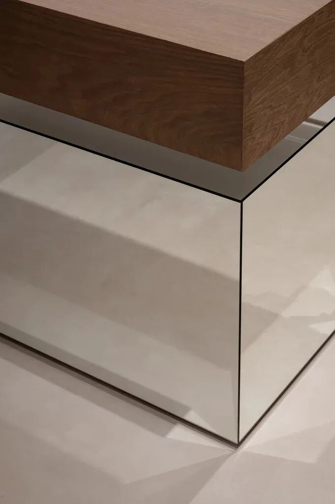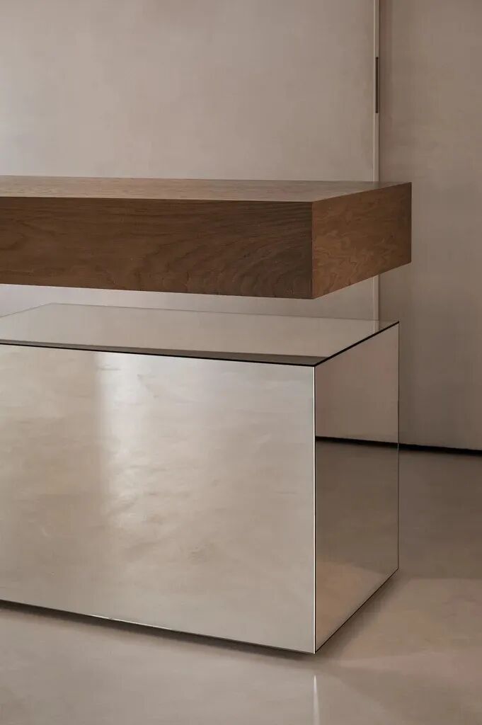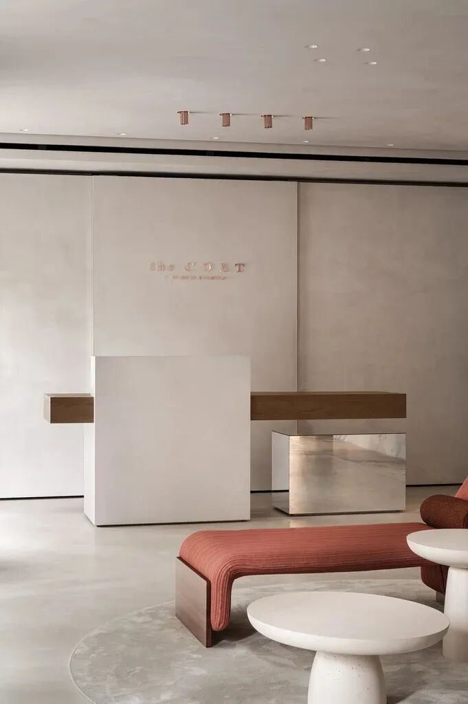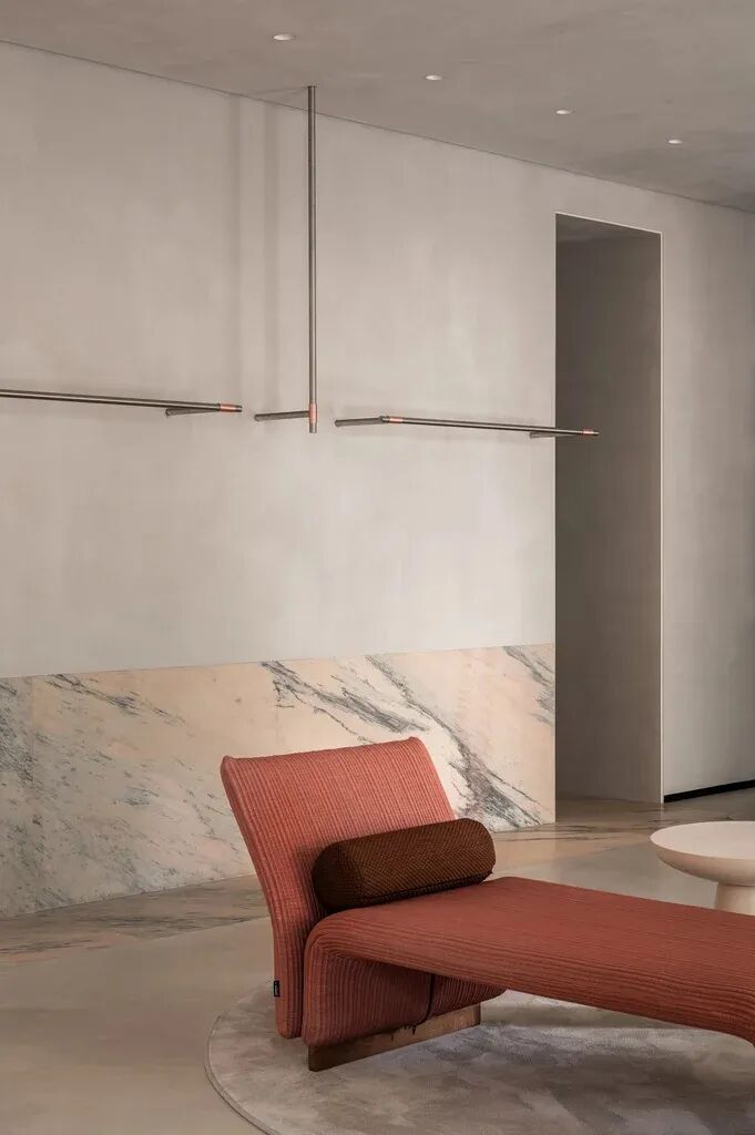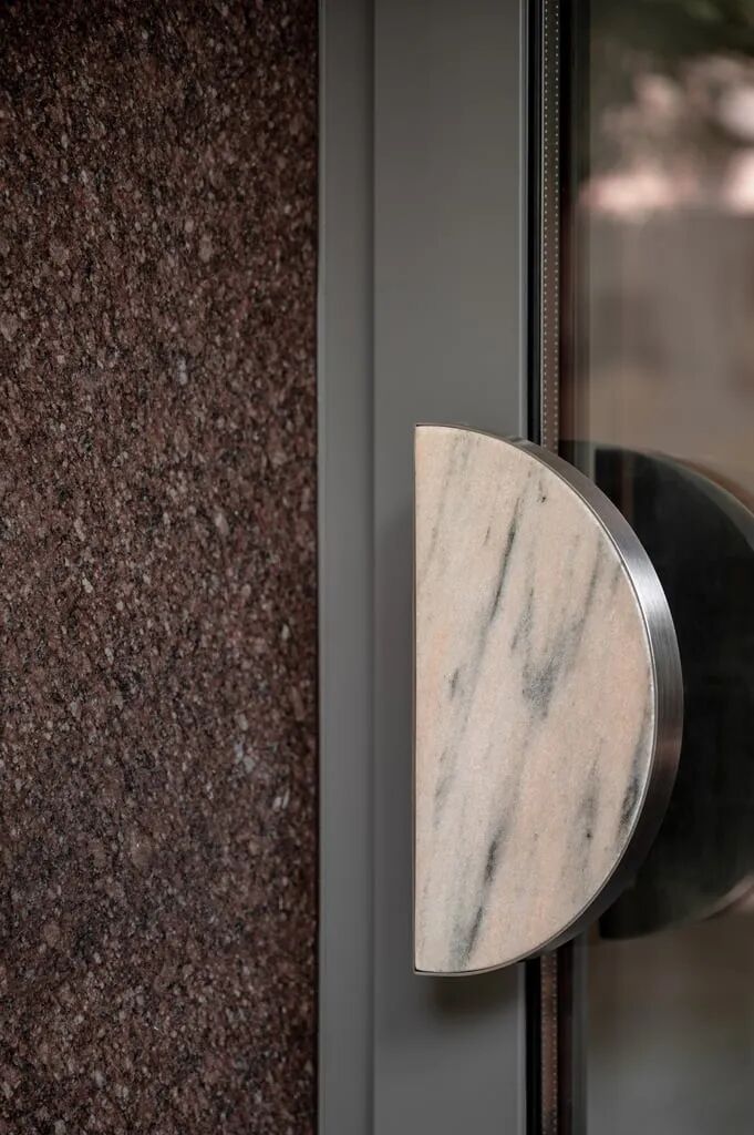 Rosa Aurora石元素也带有粉色阴影。融入墙壁和地板,突出了主展区。这种类型的大理石也传达了自然的美丽和温柔,实现了Katya Silchenko的COAT概念。因此,整个调色板巧妙地统一了一个无所不在的色调
