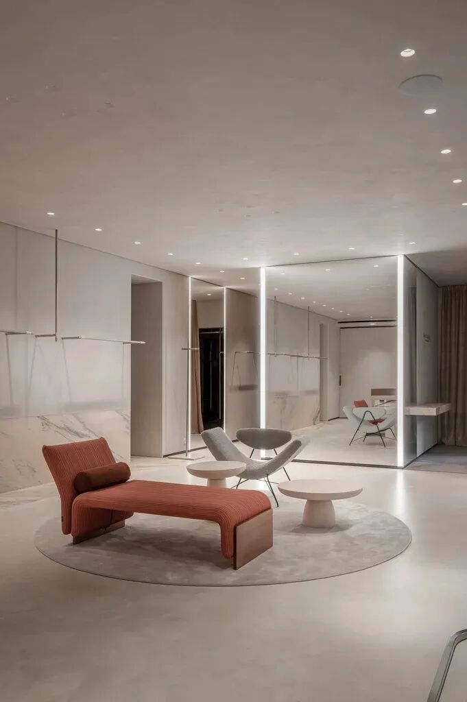 The visual concept of the object is based on rhythmicity and recurrence that unfold through the placement of accent lighting and clothing racks.