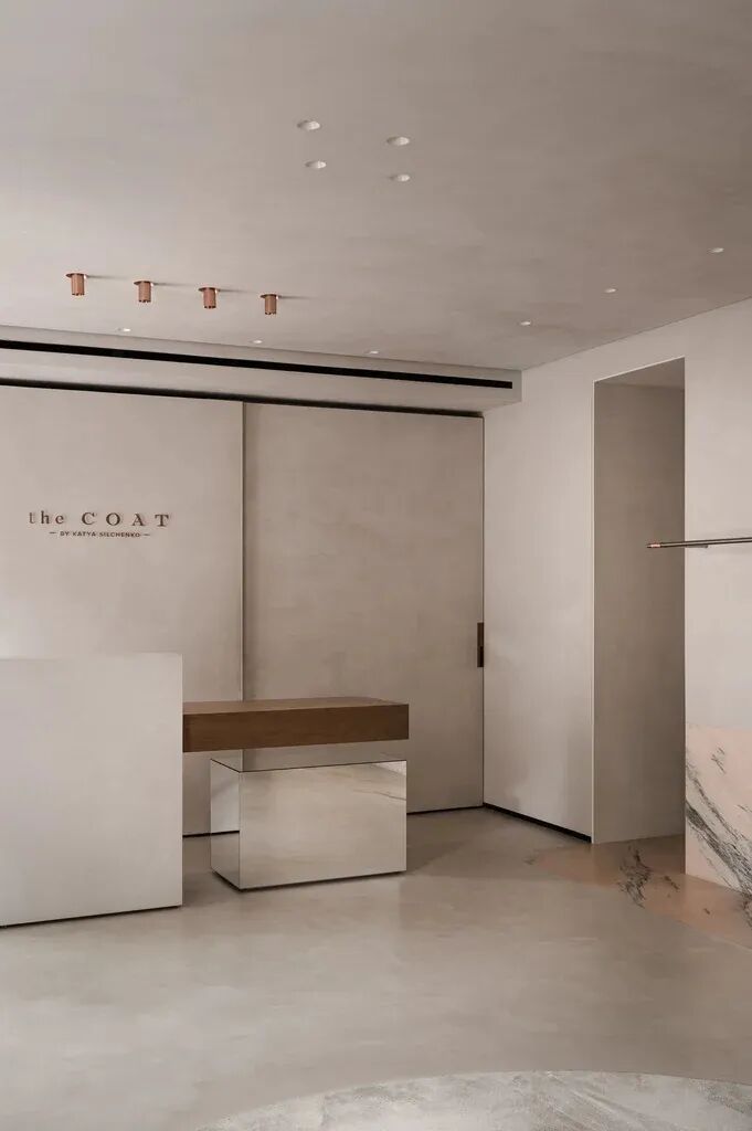 The Rosa Aurora stone element has a pink shade to it, as well. Being integrated into the walls and the floor, it highlights the main exposition area. This type of marble also conveys natural beauty and tenderness, actualizing the concept of the COAT by Katya Silchenko. Thus, the whole colour palette is delicately unified with one omnipresent shade.