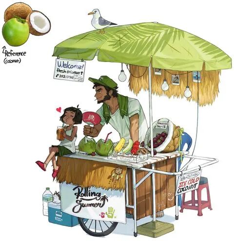 不仅创意绝,二者的对比也让人直呼,日常物品“成精”了。“性感”的淋浴喷头,可爱的椰子小妹妹,还有酷炫的电话亭......这位插画家直言,自己喜欢创作一些受世界上所有事物启发的角色,当自己的创作灵感匮乏,或者遇到瓶颈的时候,他总能从目之所及的地方,找到一个全新的灵感。