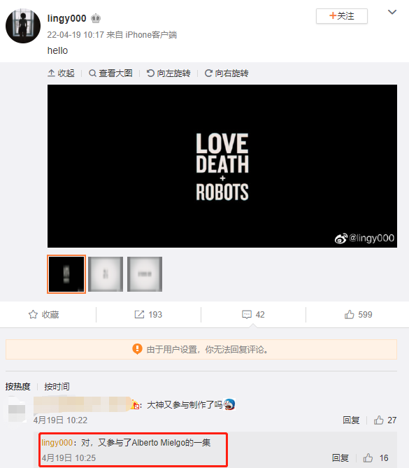 凌云表示自己参与了Alberto Mielgo导演的这集