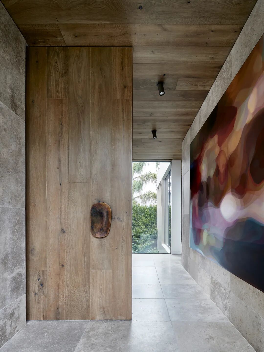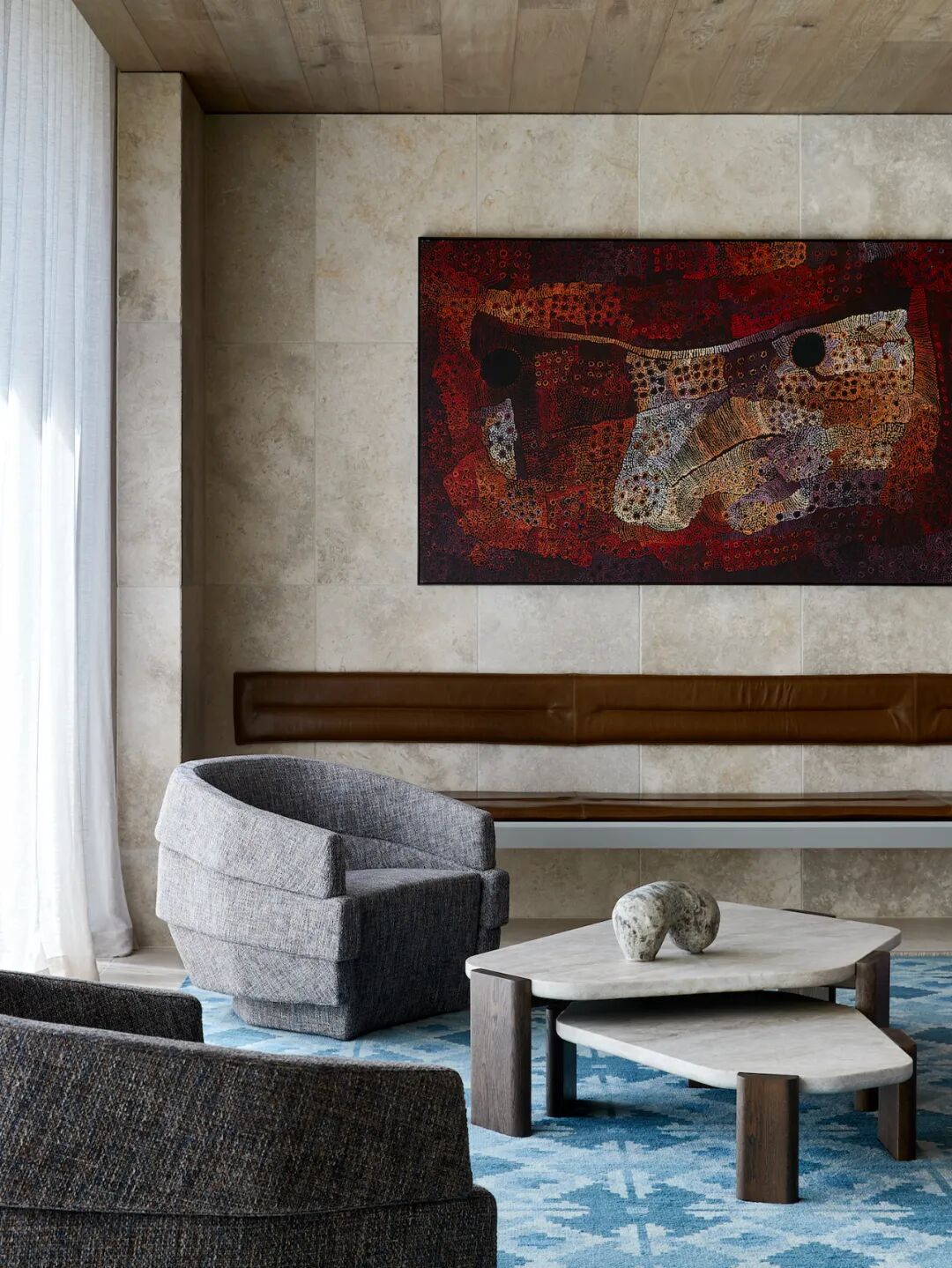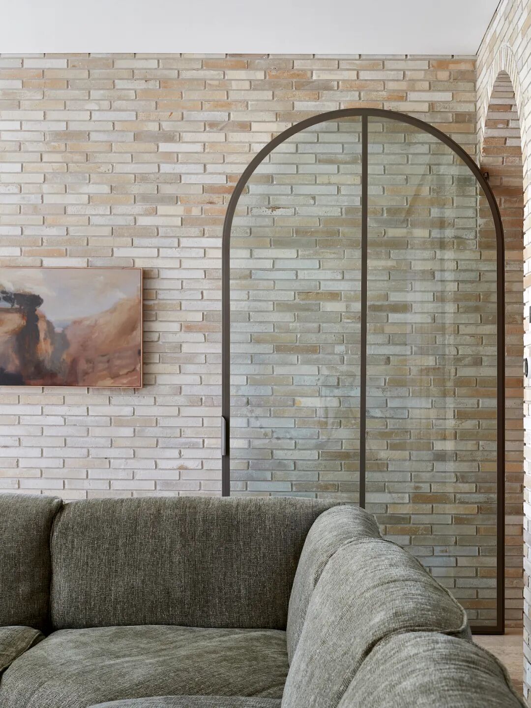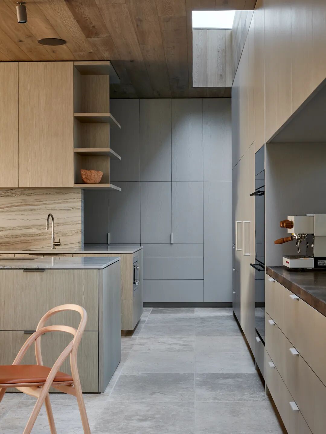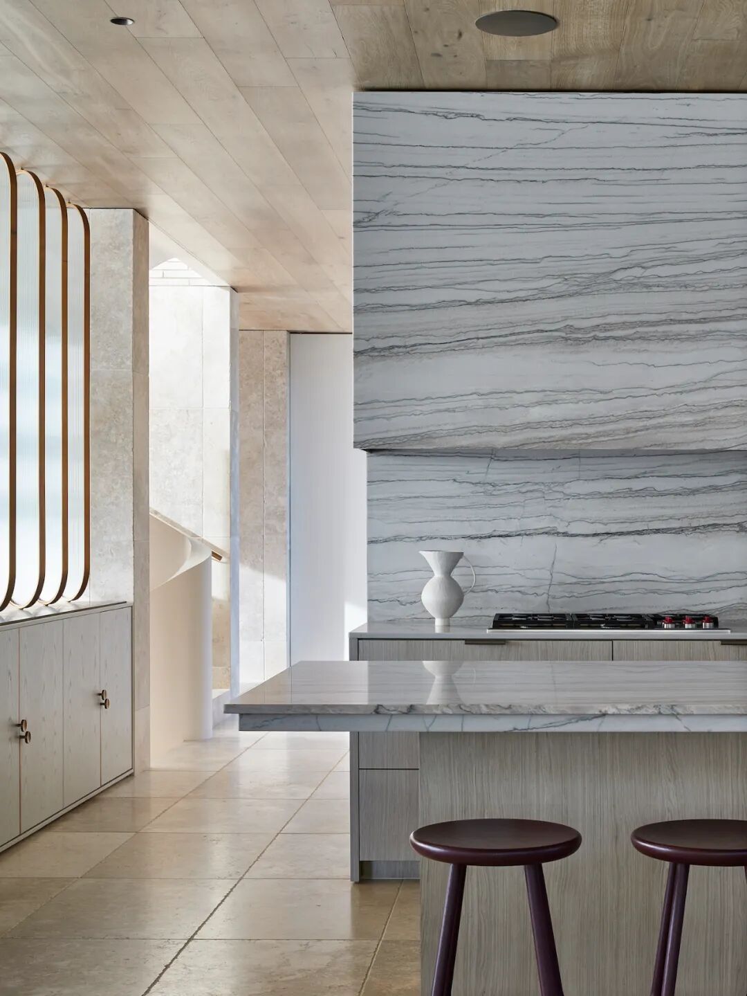 The home takes its name from the striking exterior, clad in limestone tiles and handcrafted bricks of a similar color. The two substrates run throughout the first floor, with sandblasted wood drift veneer joinery, brass accents and warm oak ceilings. Cool grey linen sheer curtains add softness to each window, filtering the northern lights throughout the day. Delicate shades of olive green, walnut, pale pink and teal furniture sit harmoniously within the stone shell, allowing custom-designed light fixtures and contemporary art to sing.