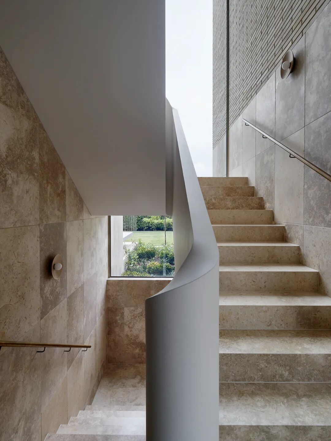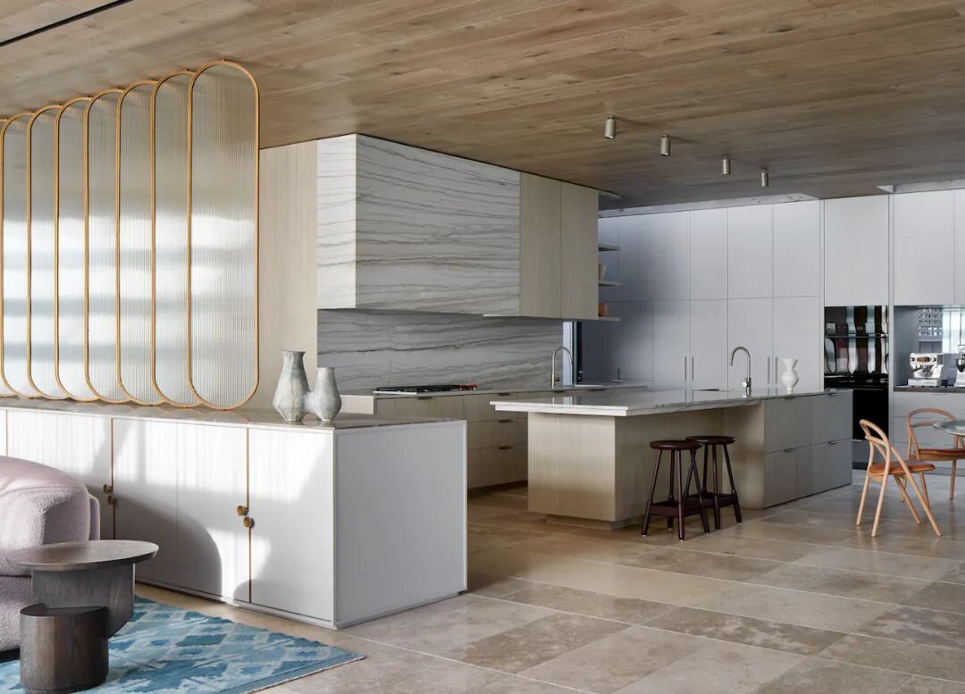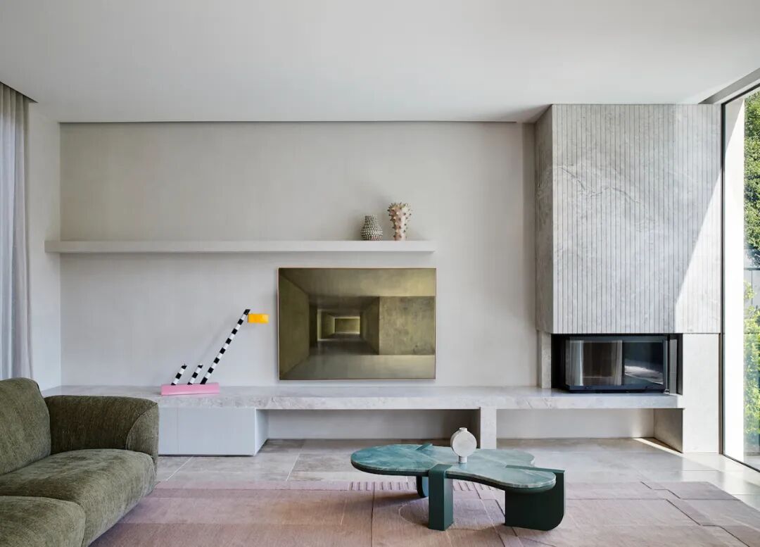 房屋的名字来自醒目的外观,包裹在石灰石瓷砖和手工制作的类似颜色的砖块中。这两种基材贯穿整个一楼,采用喷砂木漂移单板细木工、黄铜装饰和温暖的橡木天花板。冷灰色亚麻透视窗帘为每个窗口增添了柔软感,全天过滤北极光。橄榄绿、胡桃木、淡粉色和蓝绿色家具的精致色调和谐地坐落在石壳中,让定制设计的灯具和当代艺术唱歌。