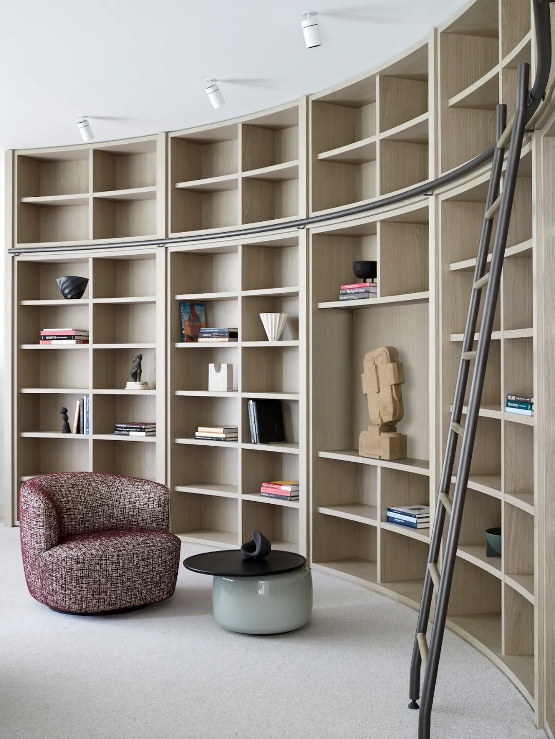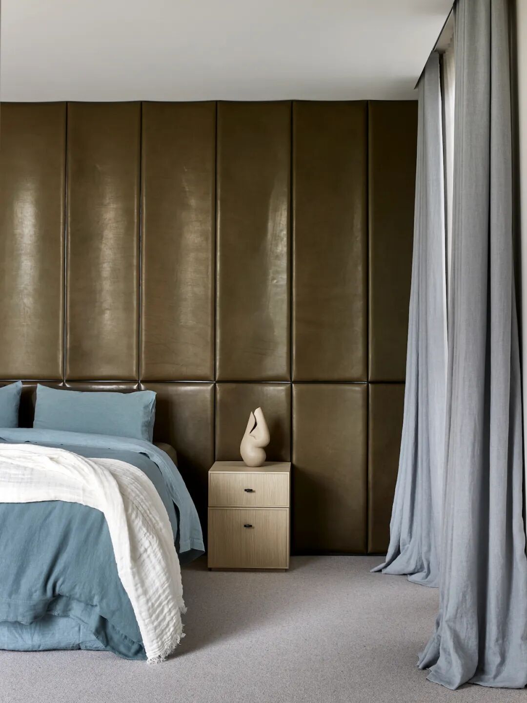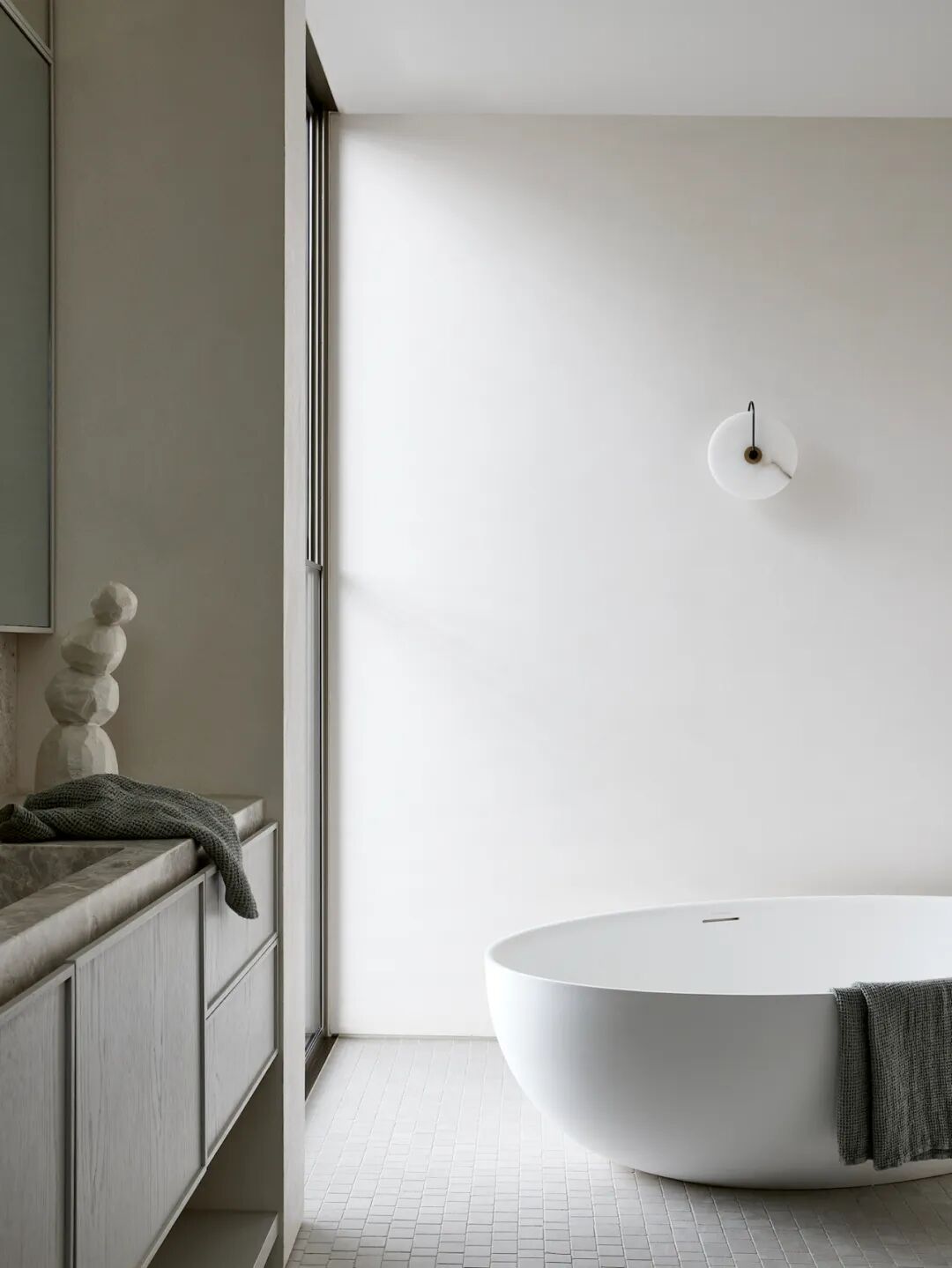 房屋的名字来自醒目的外观,包裹在石灰石瓷砖和手工制作的类似颜色的砖块中。这两种基材贯穿整个一楼,采用喷砂木漂移单板细木工、黄铜装饰和温暖的橡木天花板。冷灰色亚麻透视窗帘为每个窗口增添了柔软感,全天过滤北极光。橄榄绿、胡桃木、淡粉色和蓝绿色家具的精致色调和谐地坐落在石壳中,让定制设计的灯具和当代艺术唱歌。