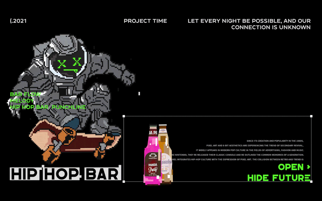 自上世纪80年代始创并流行以来,像素艺术和8位元美学目前正经历着二次复兴的潮流,广泛出现于从广告、时尚到音乐等领域的现代流行文化之中。就像任天堂一样重新发售他们的经典主机,重新勾勒起一代人的共同回忆。X PIXEL以像素艺术的表现融入HIP-HOP文化,复古与潮流的碰撞让人耳目一新,在X PIXEL里你可以寻找到自己最REAL的一面。