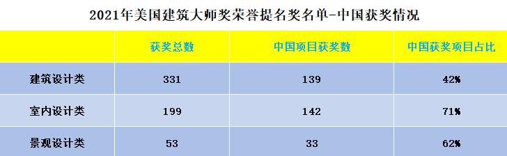 本届建筑设计类共计331个,中国项目斩获139个,占比42%;室内设计类共计199个,中国项目斩获142个,占比71% ;景观建筑类共计53个,中国项目斩获33个,占比62% 。