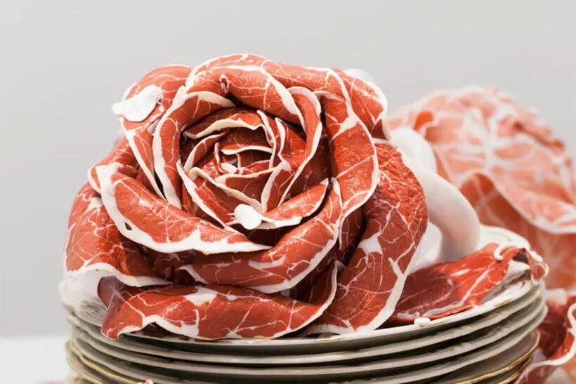 这些特殊的雕塑作品,给人们带来一种视觉上的诱惑力,逼真至极的肉片通过叠加累积变成花朵模样,让人忍不住将它涮、烤、炸一番。不过,这些肉雕作品,也让一些人感到不安和紧张,对于这些肉雕作品的负面评价也不在少数。