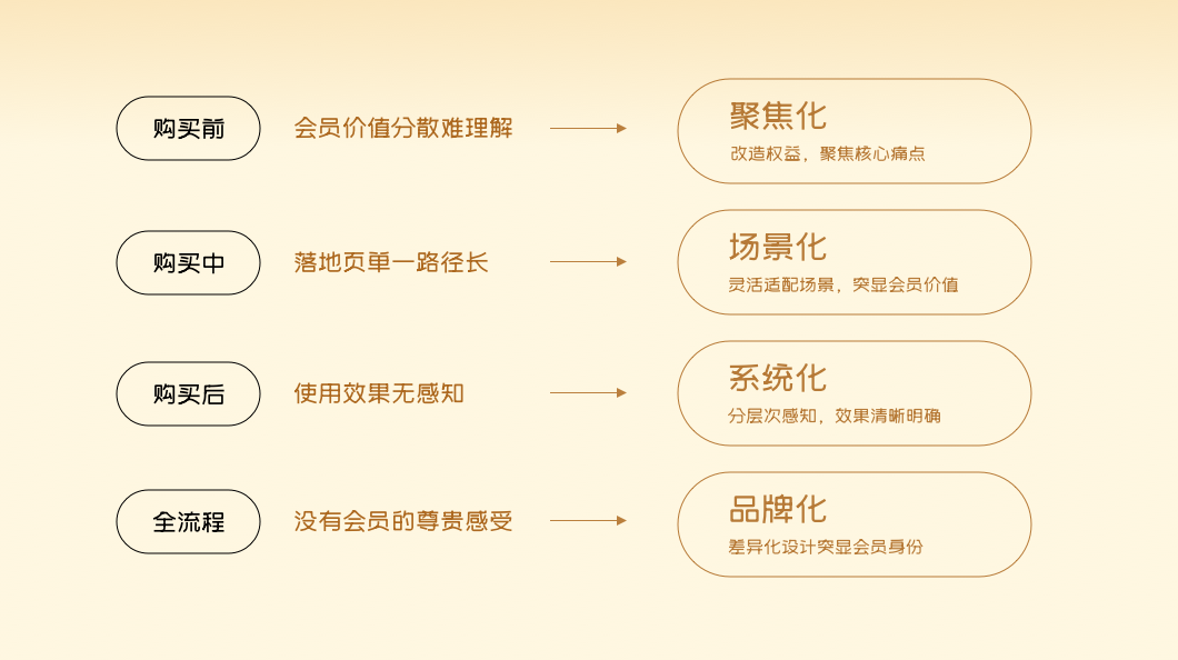 根据问题的确定,我们的设计目标也就明确了:1、聚焦化,改造权益,聚焦核心痛点。2、场景化,灵活适配场景,突显会员价值。3、系统化,分层次感知,效果清晰明确。4、品牌化,差异化设计突显会员身份。