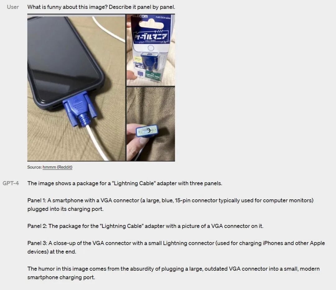 图像理解(多模态):这是一个非常有趣的方面。GPT-4不仅能让你理解图片中的内容,还能让你理解上下文及其含义。就像下图中,GPT-4可以从一个表情包图片中解释和开玩笑。