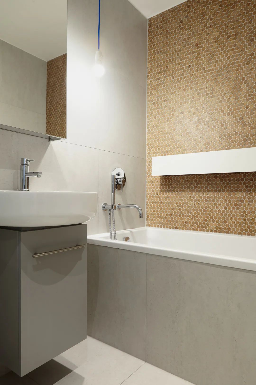 软木也以圆形马赛克的形式出现在浴室的墙上,它与超大的灰色瓷砖一起成为一个有趣且不引人注目的细节。浴室布局的变化和将洗衣机移到入口大厅允许放置浴缸和淋浴。