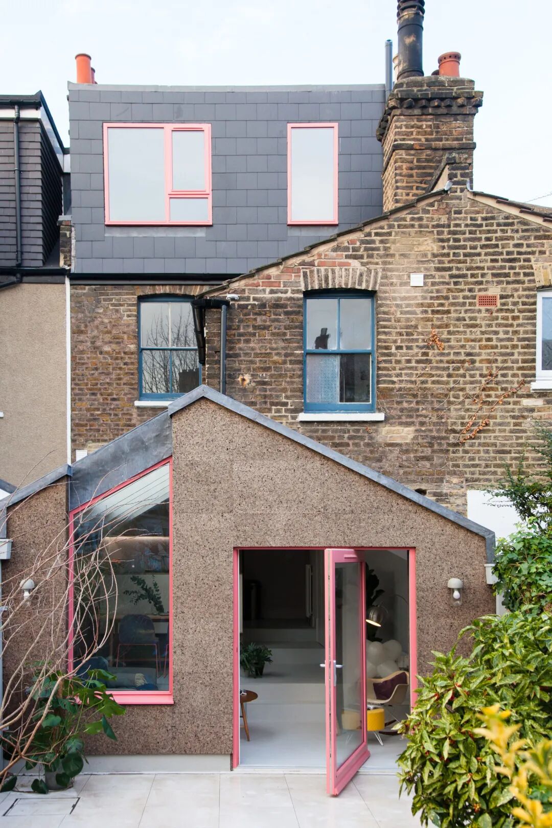 伦敦南部一座露台房屋的后部延伸部分借鉴了维多利亚时代的建筑元素,将现代设计特色融入了新空间。扩建部分的简单斜屋顶与主屋的形状相呼应,但也可容纳玻璃屋顶和狭缝窗,让室内有着充足的光线。
