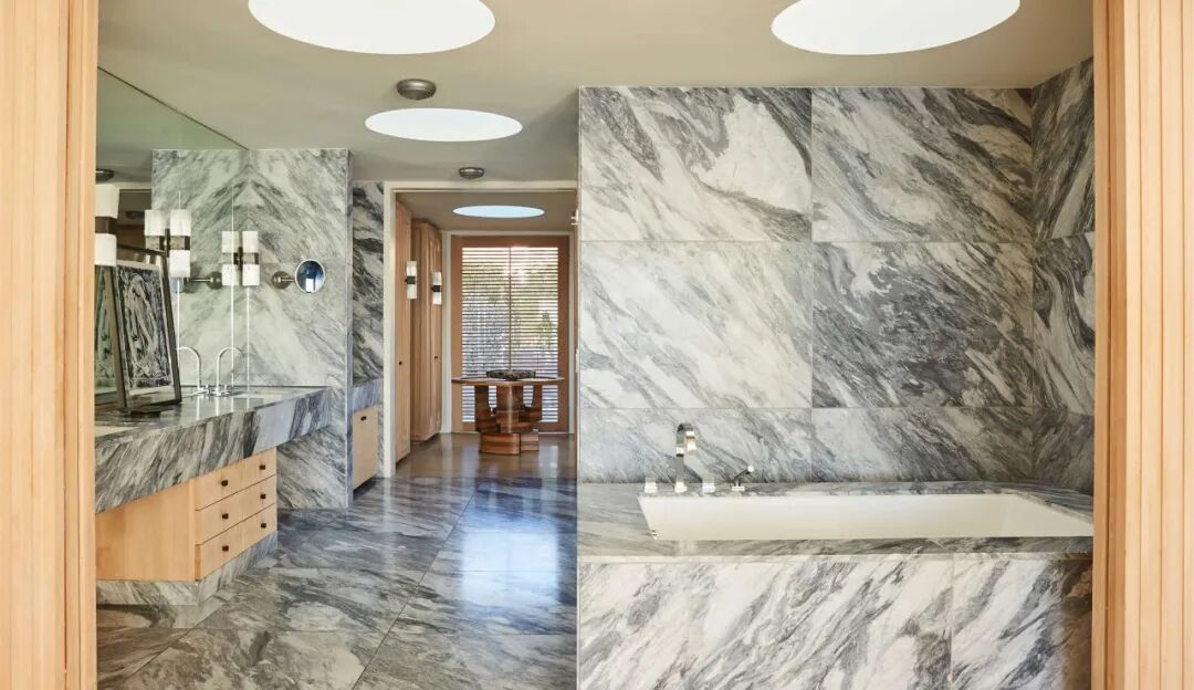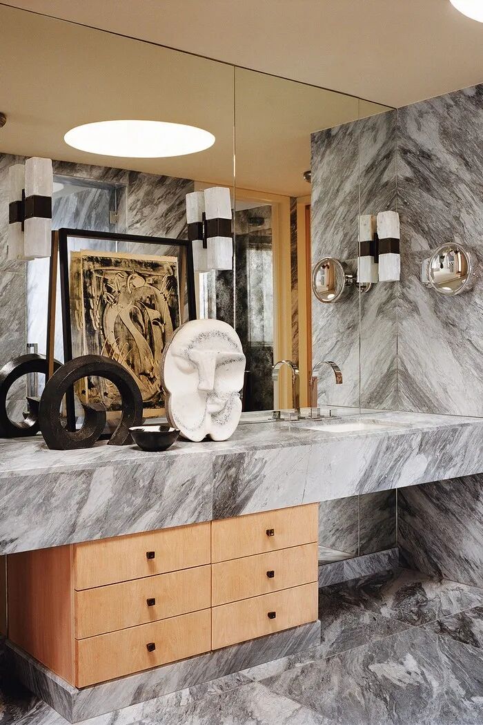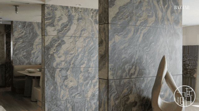 主卧浴室以大理石为背景,白与灰在墙面晕染,将“水”元素通过材质表达出来。桌面摆放的现代雕塑,如同贝壳,点缀这个“水”空间。