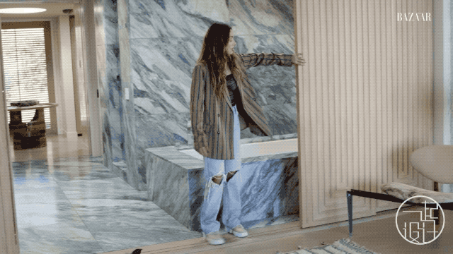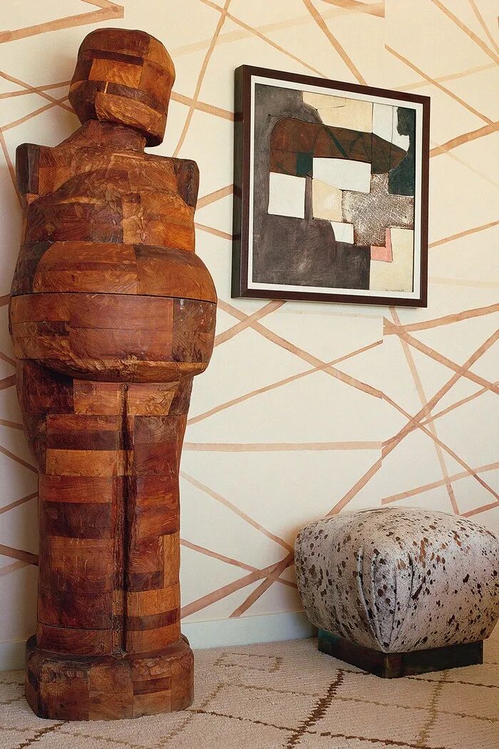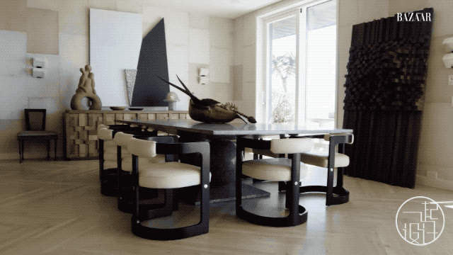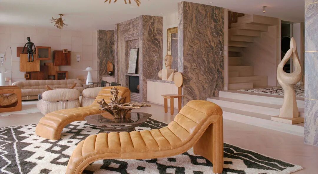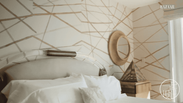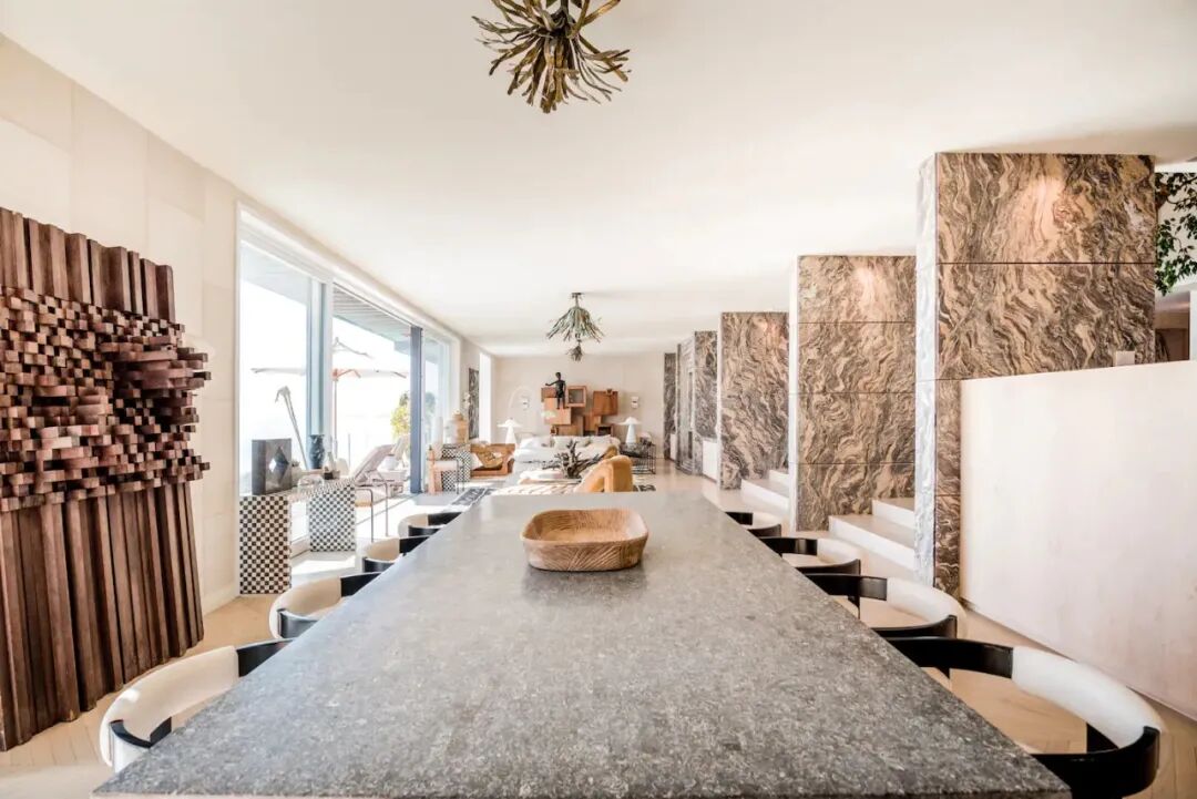 从巴黎跳蚤市场淘来的,希拉·希克斯设计并手工编织的的条纹挂毯;拼接木饰面、粉红色贝壳壁纸,看似无章法的线条......风格各异的装饰元素,与海景相互偎依,焕发光彩。