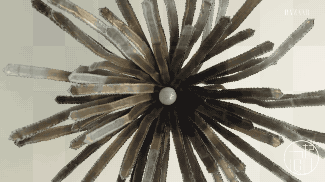 铜绿吊灯在空气的氧化下,开始泛绿,像一只海胆。整个客厅中有三盏这样不同尺寸的艺术灯具。