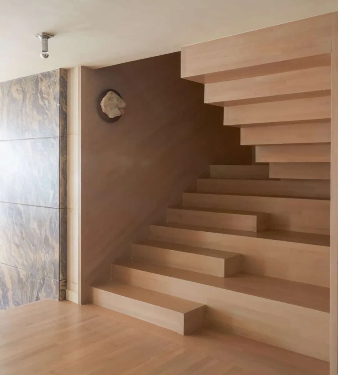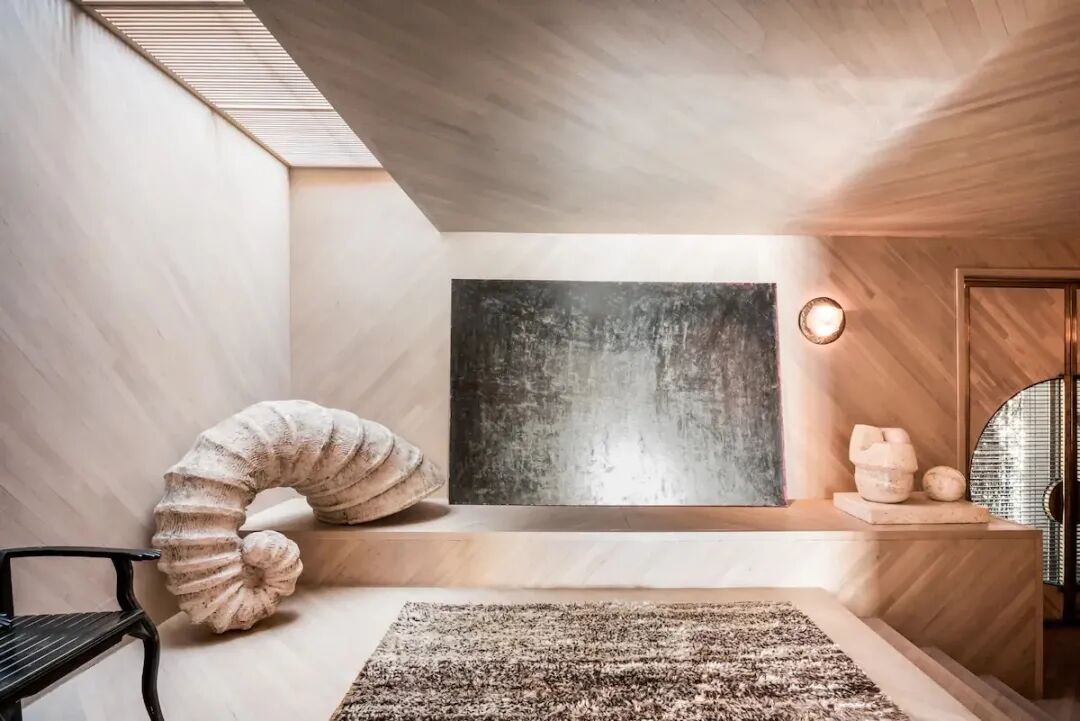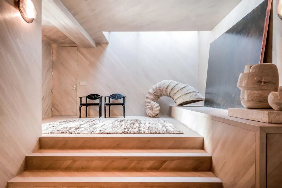 极度舒适的负空间雕塑楼梯,出自Kelly工作室。温和的胡桃木色过渡了上下层空间。