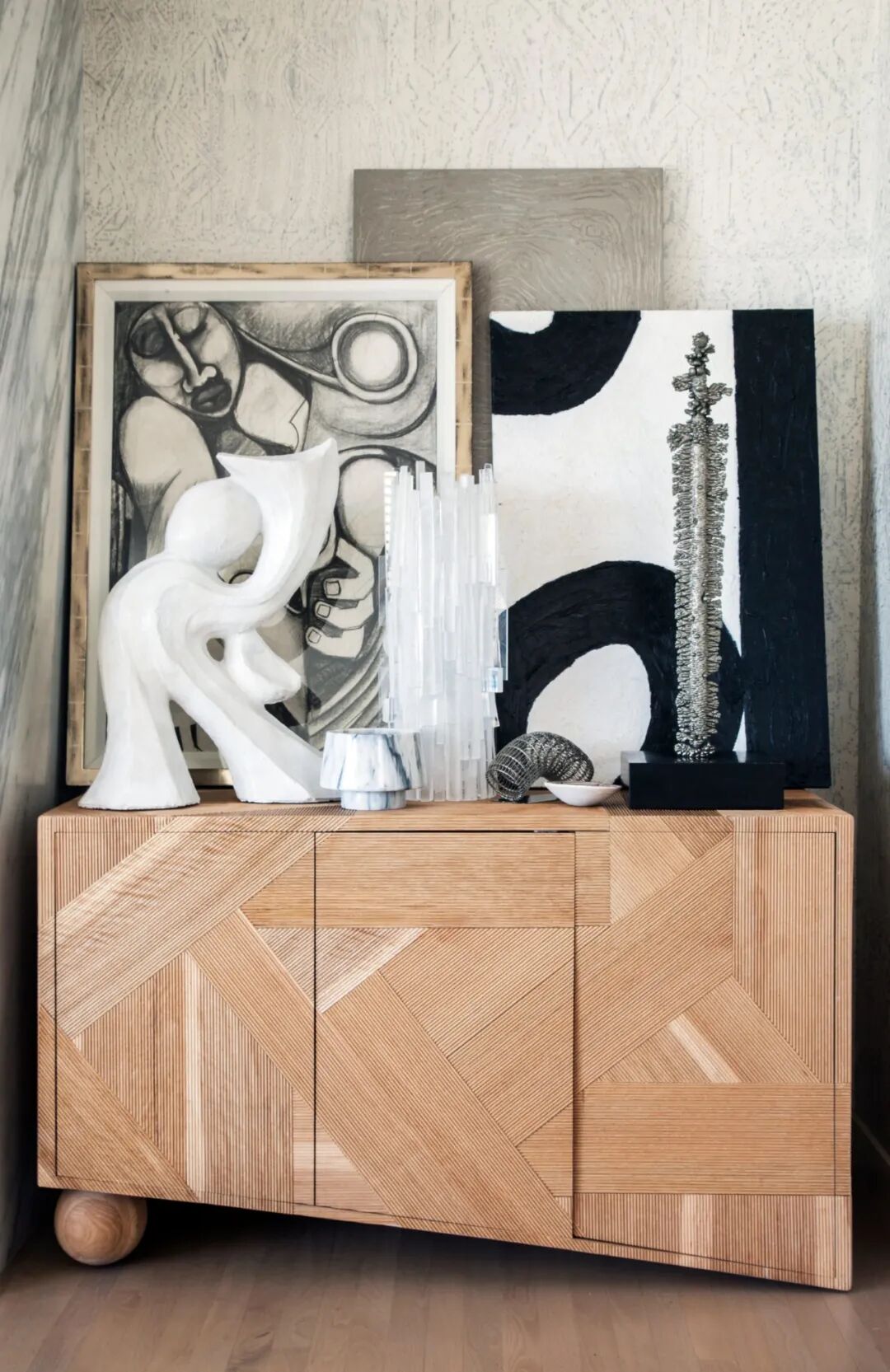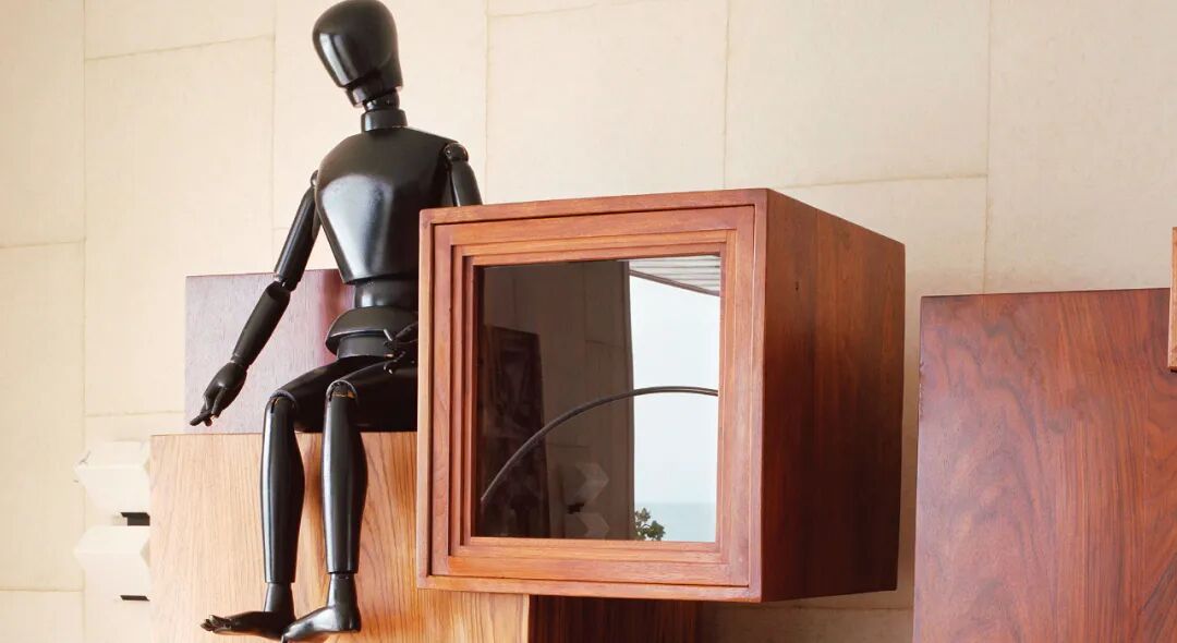 几何橱柜也大有来头,是个1970年的古董家具。黑色艺术家雕塑,和宜家经典的木头小人如出一辙,可跟随主人情绪变化动作,以不同状态陪伴家人。