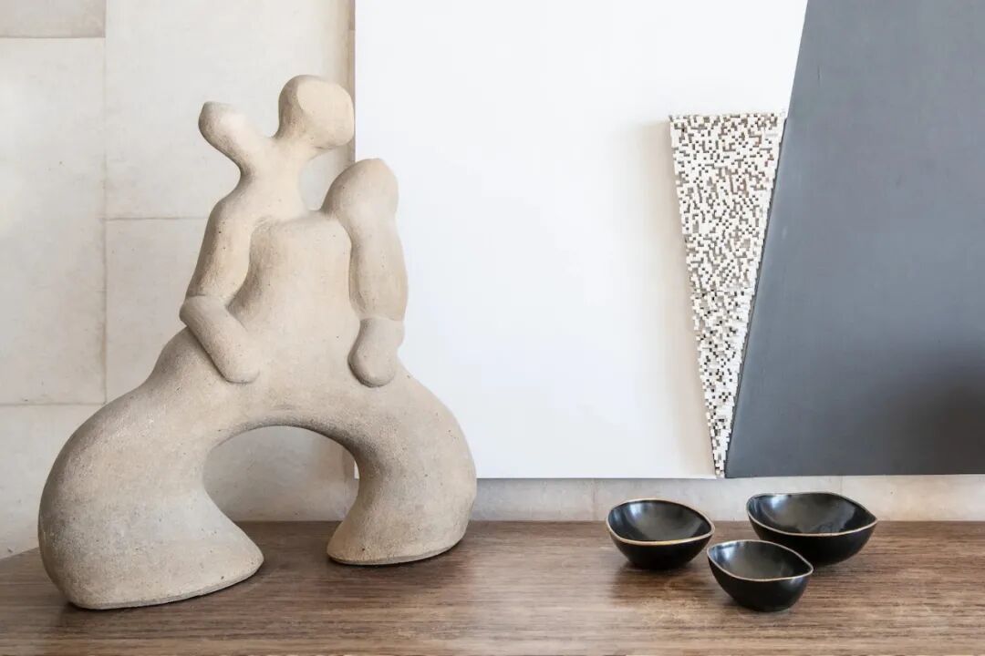 石桌和黑白相间的餐椅构成餐厅主体,它们规整的排列于空间中心,与随意摆放的雕塑、墙板形成对比。