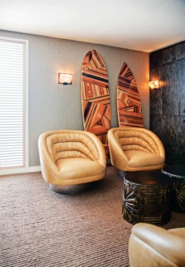 客厅左侧,波浪形休息椅,皮质感令人联想到波光粼粼的海浪。