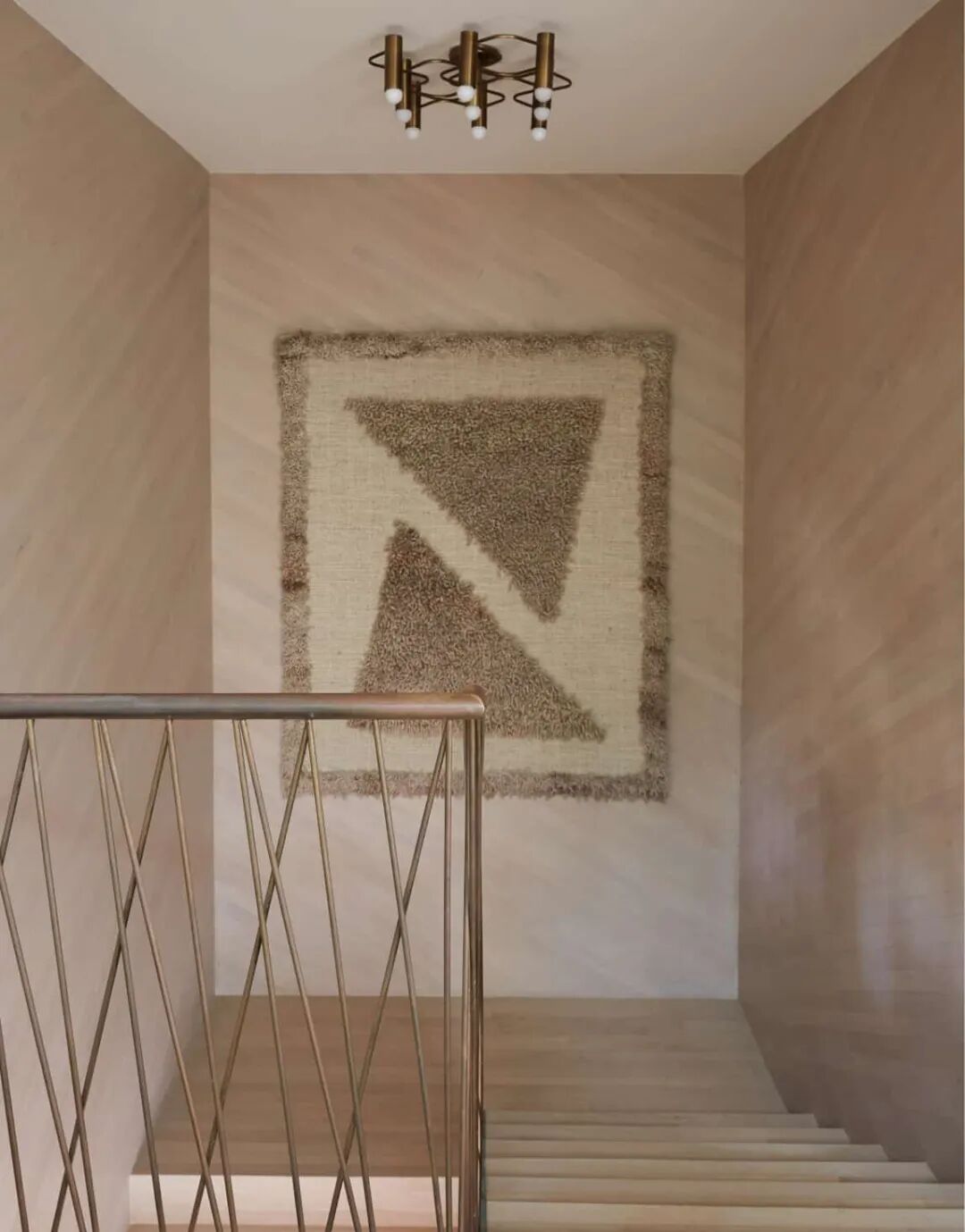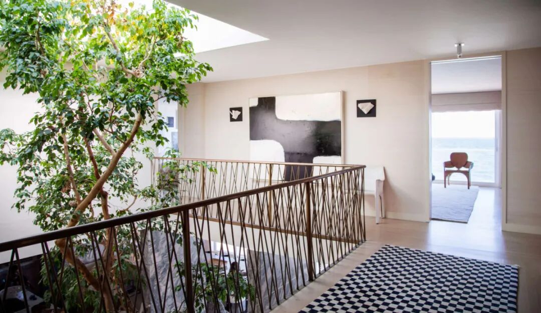 楼梯扶手是古铜色金属栏杆,硬朗的质感打破空间中绵柔的氛围。