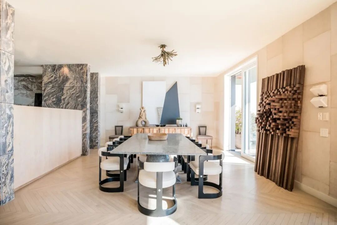 餐厅与客厅形成层级关系。漂白胡桃木地板和大理石镶板墙,白色大理石岛台呼应墙面与地板的纹路。