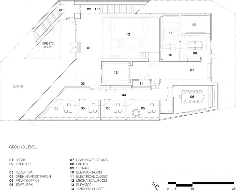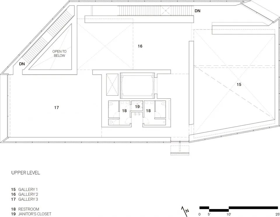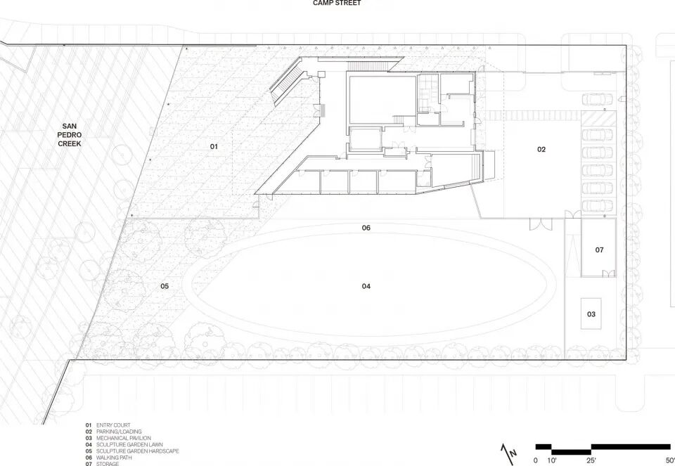 参观者从俯瞰Chris公园的窗边穿过三个展览空间,每个空间内部都有一个朝向不同的采光塔,将圣安东尼奥耀眼的阳光调整过滤为内部柔和的光线。在经过最后一间展室向下回到大厅之前,参观者能够在这个区域看到整个入口广场和San Pedro河,从大厅可以到达建筑南侧的室外雕塑花园。