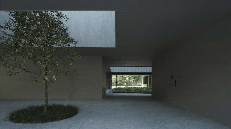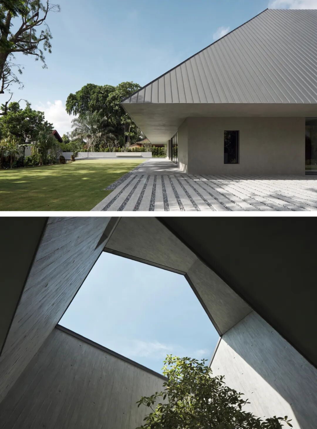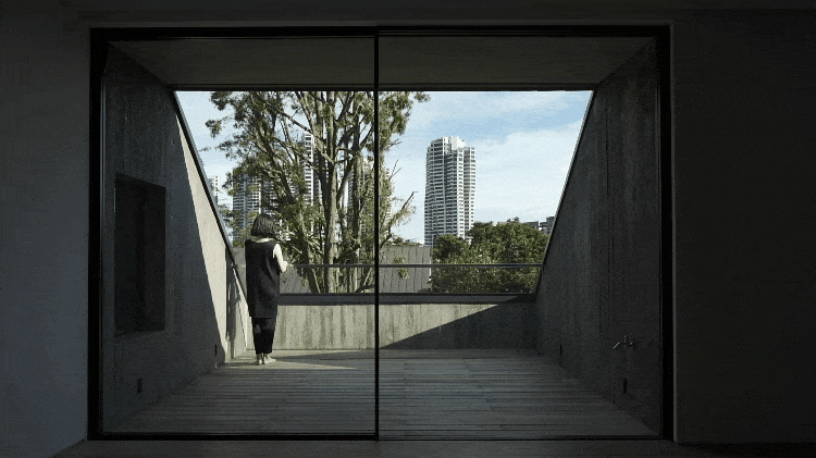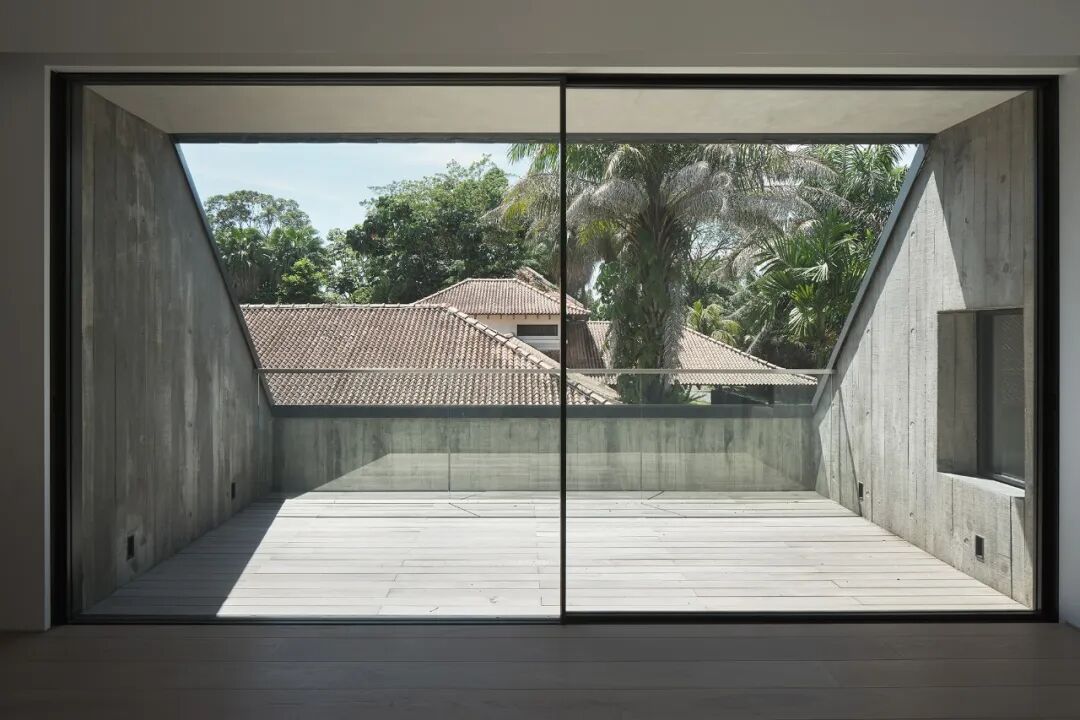 框住小树的采光井内部则是木板纹理的混凝土