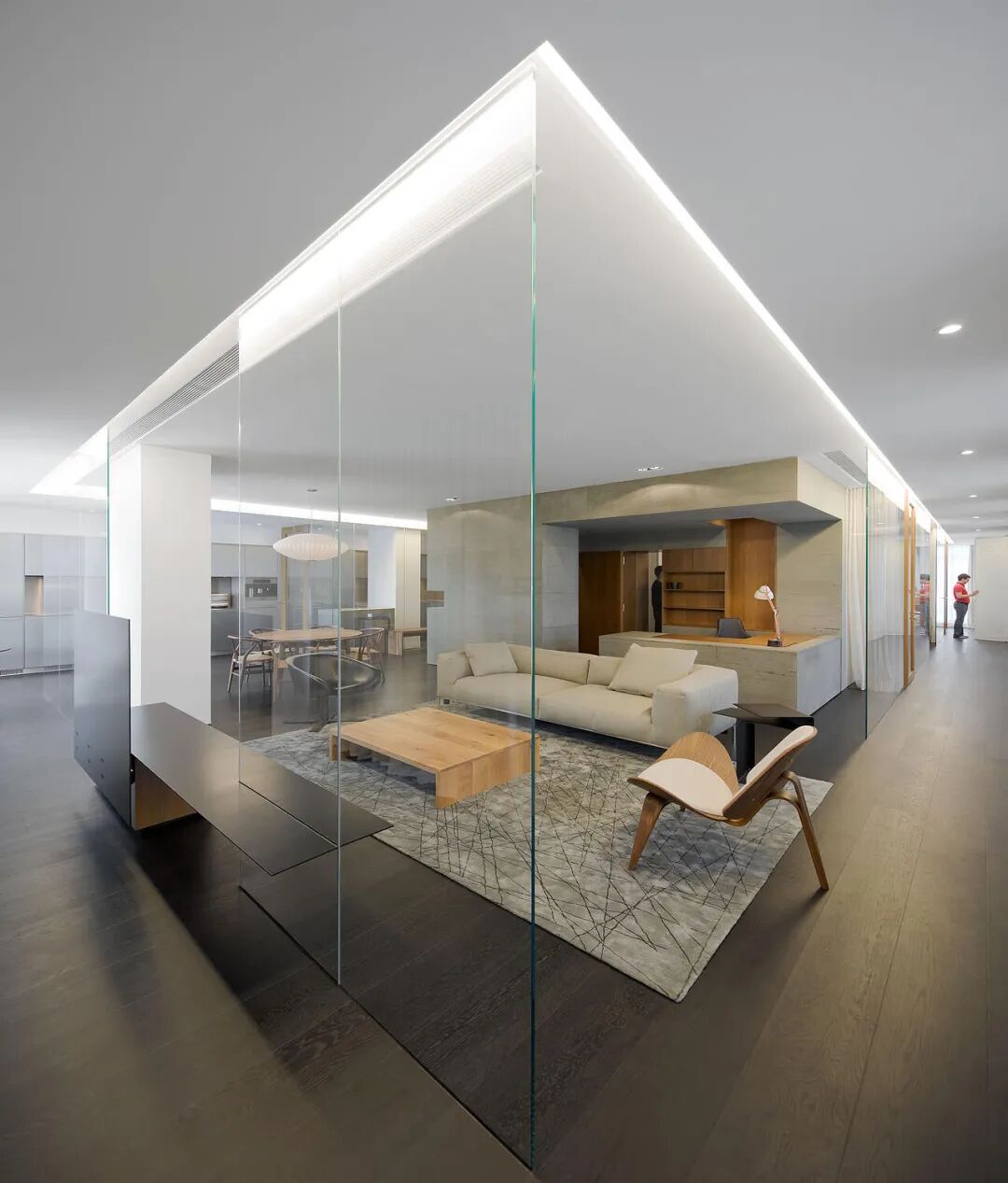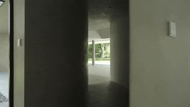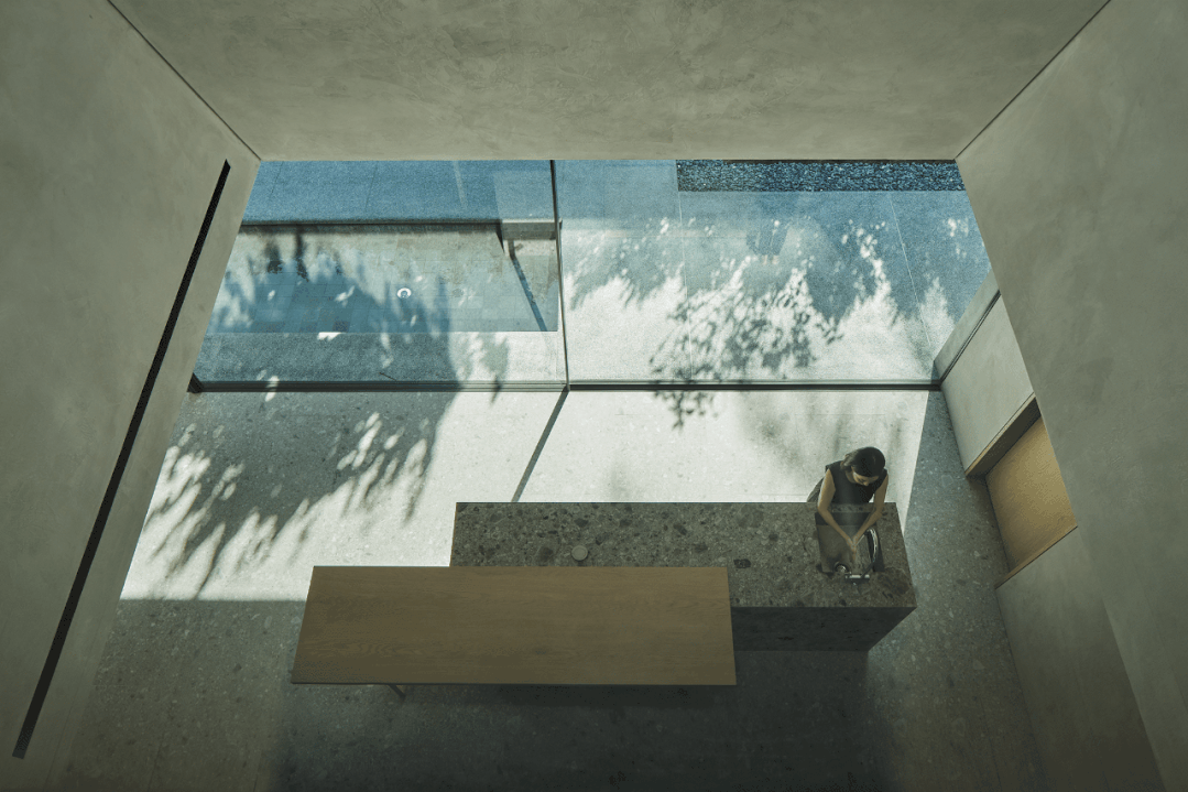 两层住宅围绕着圆形的露天中庭展开。一层有客厅、开放式厨房、餐厅和书房。大面积的玻璃墙面、玻璃门使整个楼层都被“打开”,无比通透。通透了,才能让人站在屋内的任何地方,都几乎可以看到这个家的核心:中央的纪念花园。