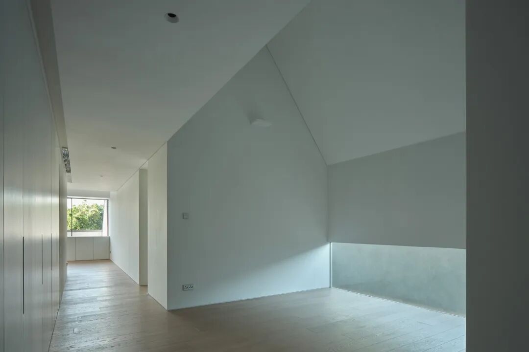 “怀想之家”的坡屋顶,还是一种建造实验。它不仅是覆盖着房子的“顶”,更包裹着整个二层,“二楼嵌在坡屋顶里,四个卧室都藏在屋顶的山墙之下,天窗、阳台、卧室与阳台之间的玻璃墙,都是在屋顶上做的‘文章’。这样一来,房子里的人能看到更多室外的花草树木;如果从外部看房子,整栋楼也仍然像一座四面坡屋顶的独栋平层。”